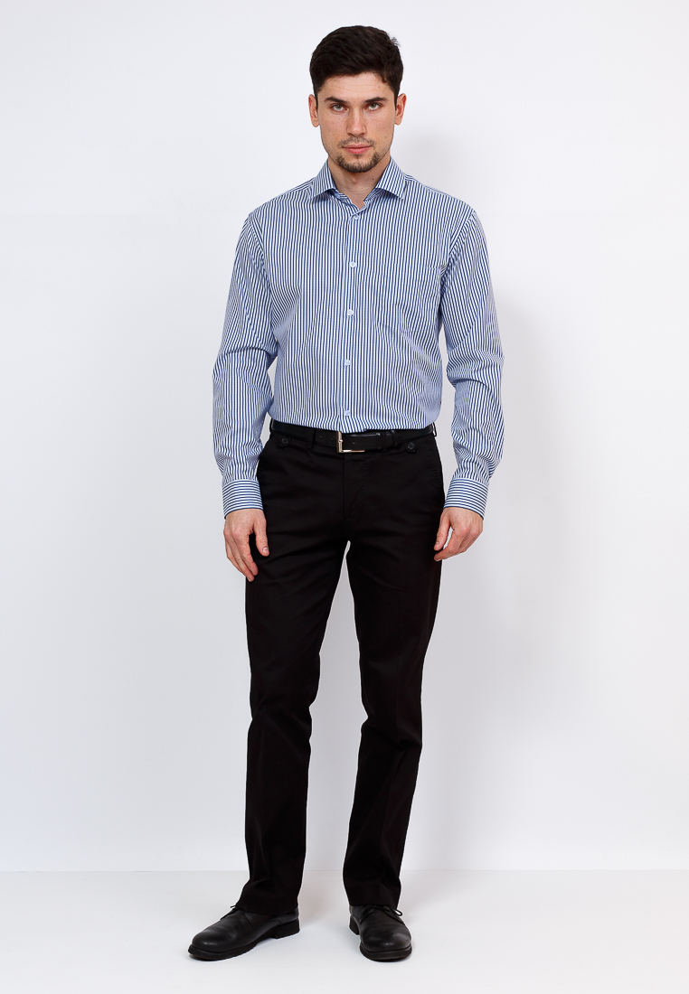 Цвет: Голубой Рисунок: Полоска..показатьi> Состав: 100% хлопок Модель: Зауженная Ворот: Французский маленький Караман: отсутствует Манжет: классический закругленный на пуговицах 6 см Силуэт: Полуприталенный силуэт / Regular fit Отделка: Сорочки- внутренняя стойка воротника и внутренний манжет из ткани компаньонаi>