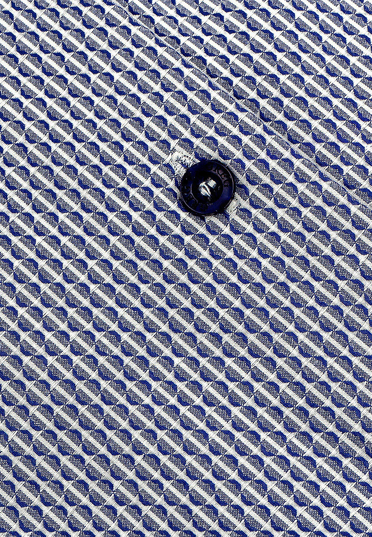 Цвет: Синий Рисунок: В мелкие эле..показатьменты Состав: 100% хлопок Модель: Зауженная Ворот: Стойка Караман: отсутствует Манжет: классический закругленный на пуговицах 6 см Силуэт: Полуприталенный силуэт / Regular fit Отделка: Сорочки- внутренняя стойка воротника и внутренний манжет из ткани компаньонаменты