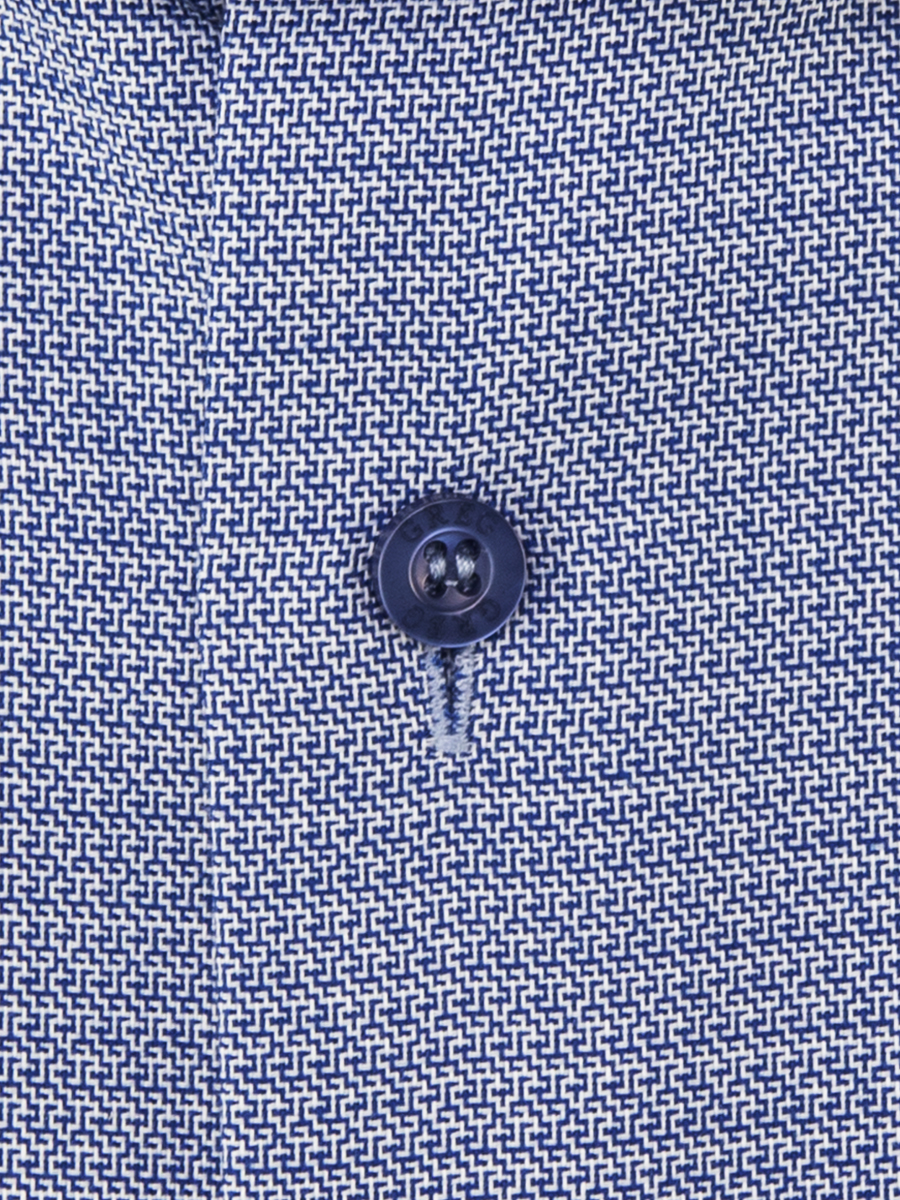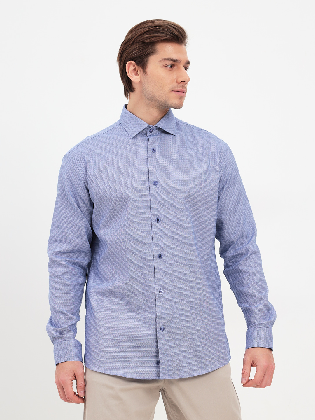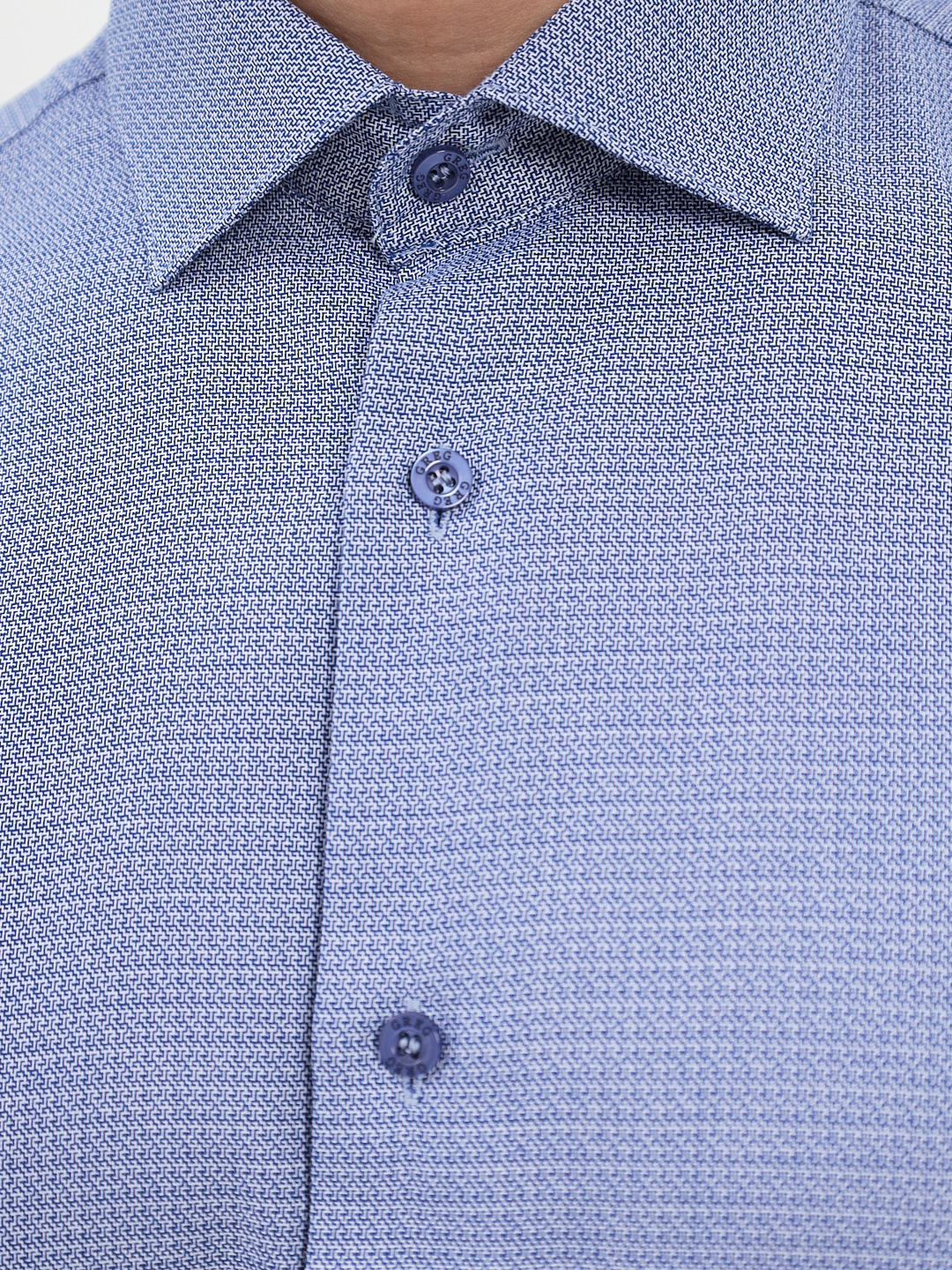 Цвет: Синий Рисунок: В мелкие эле..показатьменты Состав: 100% хлопок Non Iron Модель: Зауженная Ворот: Французский маленький Караман: отсутствует Манжет: классический закругленный на пуговицах 6 см Силуэт: Полуприталенный силуэт / Regular fit Отделка: Сорочки- кант по нижнему краю внутренней стойки воротника и внутренний манжет из ткани компаньонаменты
