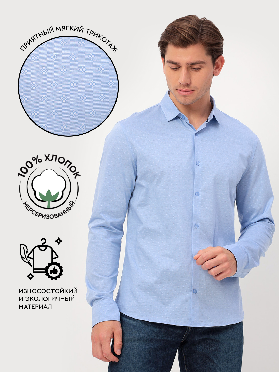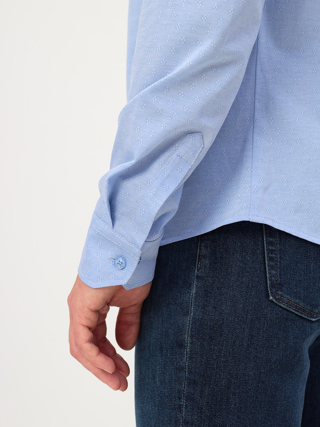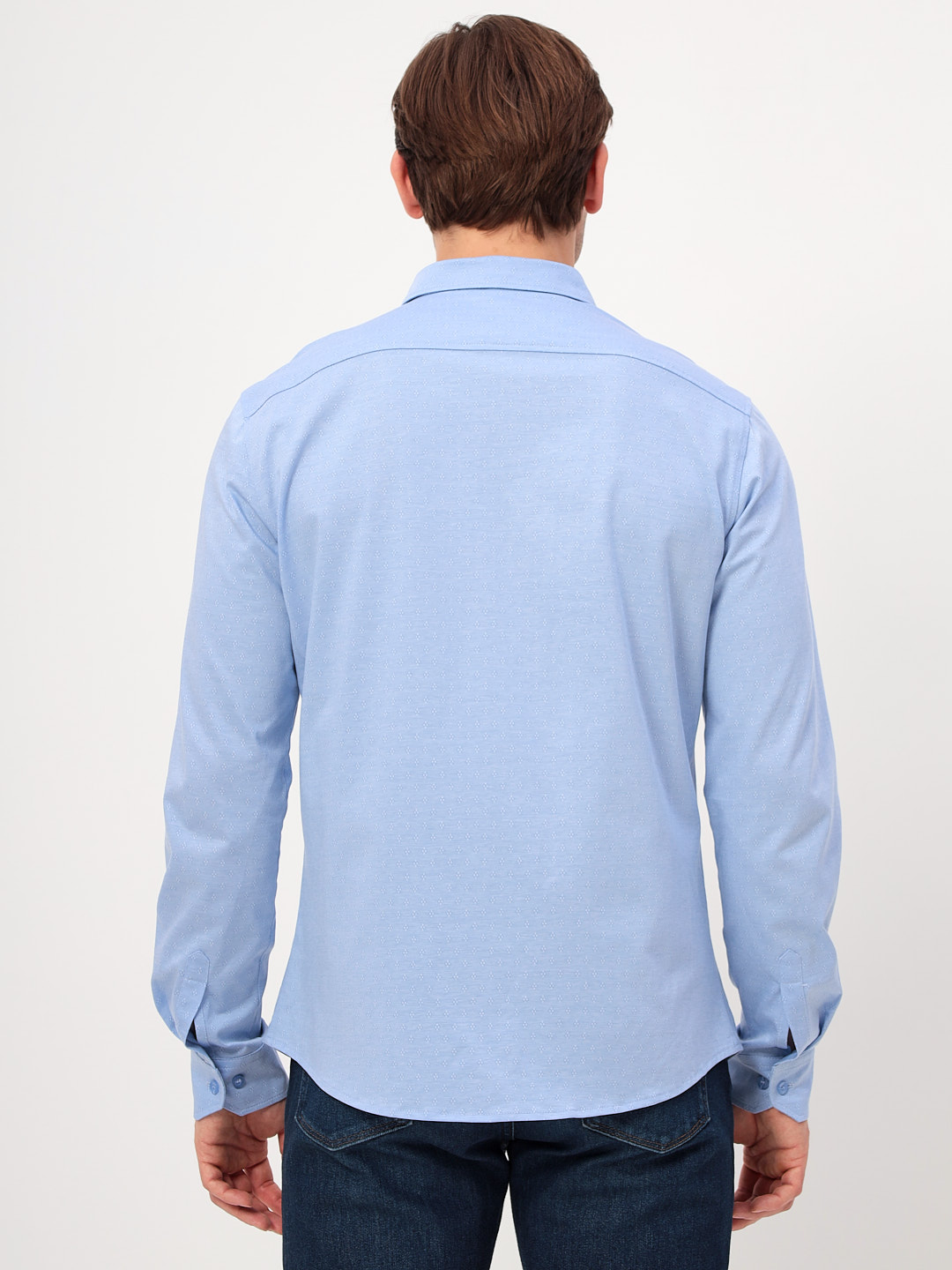 Цвет: Голубой Рисунок: В мелкие э..показатьлементы Состав: 100% хлопок Модель: Прилегающая Ворот: Немецкий мягкий Караман: отсутствует Манжет: классический с двумя срезами на пуговицах 6 см Силуэт: Прилегающий силуэт / Casual Slim fit Отделка: Сорочки- кант по нижнему краю внутренней стойки воротника из ткани компаньоналементы