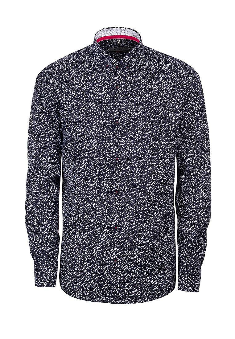 Цвет: Синий Рисунок: В крупные эл..показатьементы Состав: 90% хлопок 10% полиэстер Модель: Зауженная Ворот: Итальянский маленький на пуговицах Караман: отсутствует Манжет: классический закругленный на пуговицах 6 см Силуэт: Полуприталенный силуэт / Regular fit Отделка: Сорочки- внутренняя стойка воротника и внутренний манжет из ткани компаньонаементы