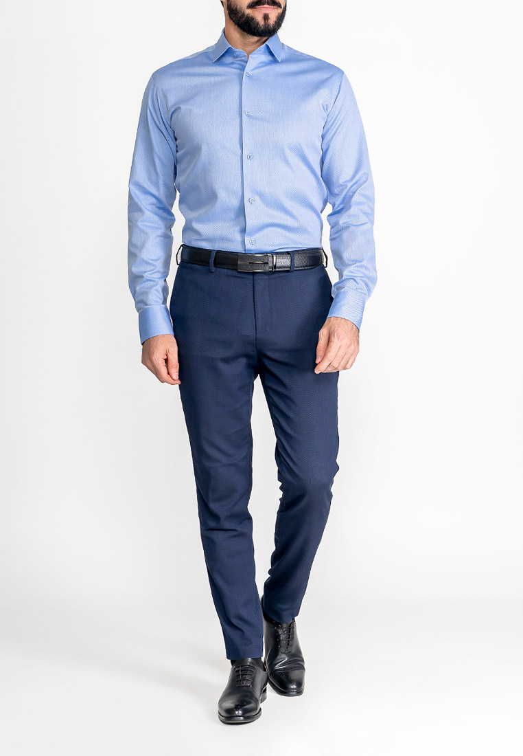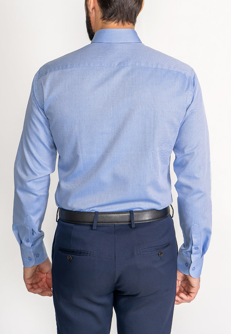 Цвет: Голубой Рисунок: В мелкие э..показатьлементы Состав: 100% хлопок Easy Care Модель: Зауженная Ворот: Французский маленький Караман: отсутствует Манжет: универсальный закругленный на пуговицах и под запонки Силуэт: Полуприталенный силуэт / Regular fitлементы