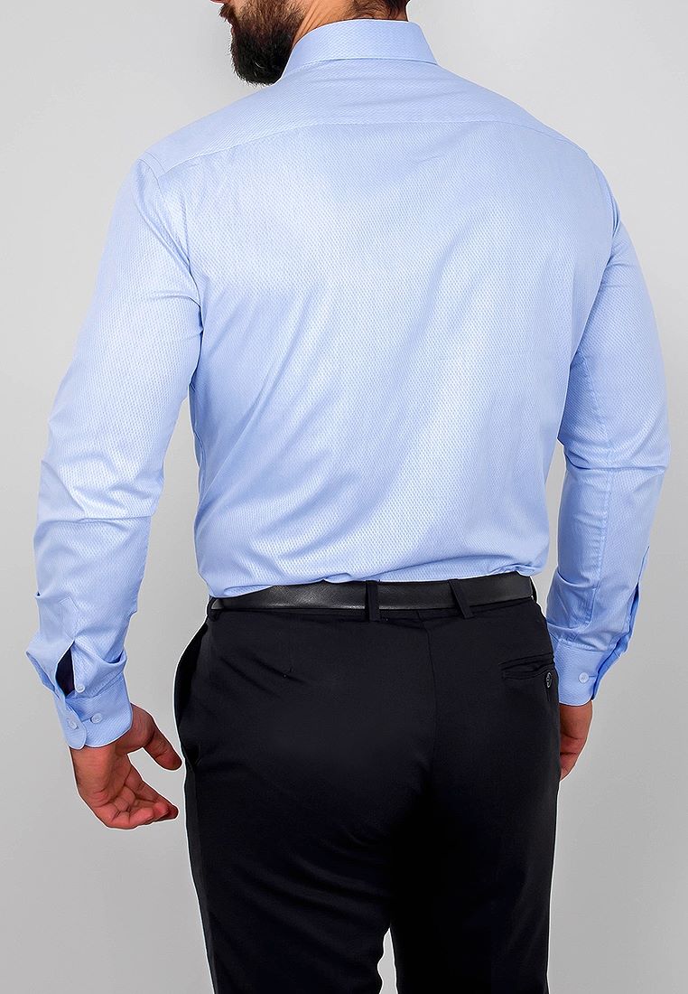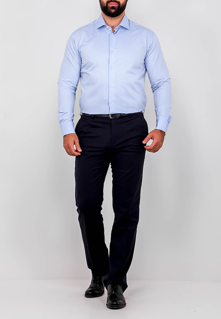 Цвет: Голубой Рисунок: В мелкие э..показатьлементы Состав: 100% хлопок Модель: Зауженная Ворот: Французский маленький Караман: отсутствует Манжет: универсальный закругленный на пуговицах и под запонки Силуэт: Полуприталенный силуэт / Regular fitлементы
