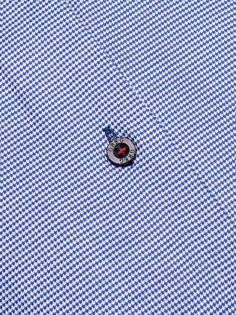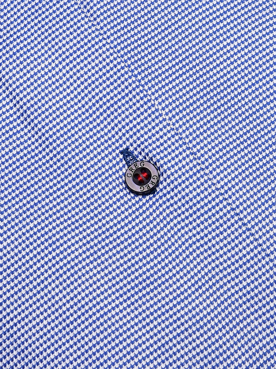 Цвет: Синий Рисунок: В мелкие эле..показатьменты Состав: 100% хлопок Easy Care Модель: Зауженная с вытачками Ворот: Немецкий Караман: отсутствует Манжет: классический закругленный на пуговицах 6 см Силуэт: Приталенный силуэт / Slim fit Отделка: Сорочки- внутренняя стойка воротника и внутренний манжет из ткани компаньонаменты