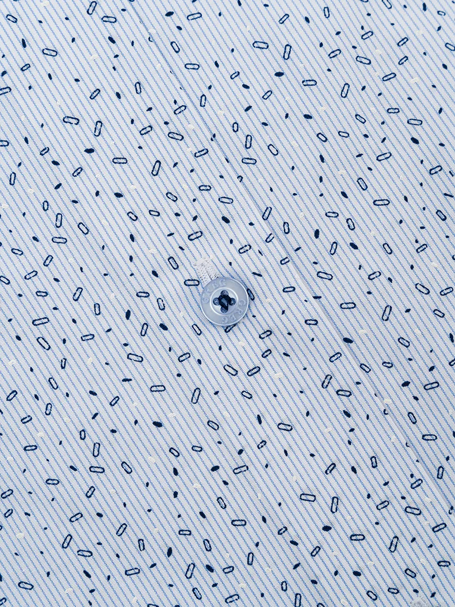 Цвет: Голубой Рисунок: В мелкие э..показатьлементы Состав: 90% хлопок 10% полиэстер Модель: Зауженная с вытачками Ворот: Немецкий Караман: отсутствует Манжет: классический закругленный на пуговицах 6 см Силуэт: Приталенный силуэт / Slim fit Отделка: Сорочки- внутренняя стойка воротника из ткани компаньоналементы