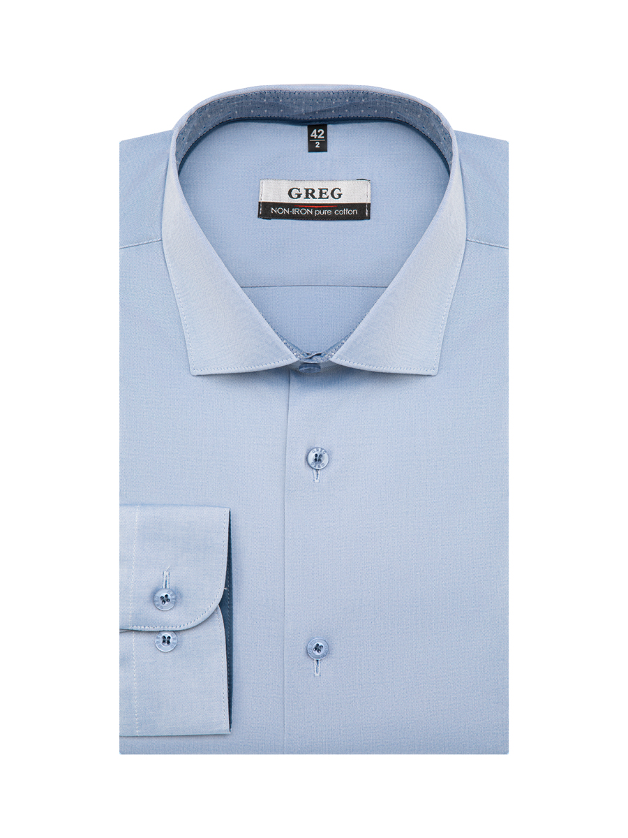 Цвет: Голубой Рисунок: Без рисунк..показатьа Состав: 100% хлопок Non Iron Модель: Зауженная Ворот: Немецкий Караман: отсутствует Манжет: классический закругленный на пуговицах 6 см Отделка: Сорочки- внутренняя стойка воротника из ткани компаньона по косойа