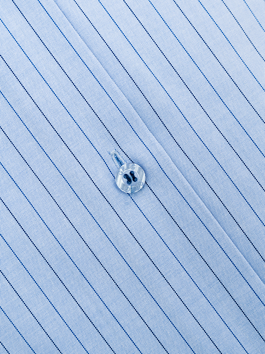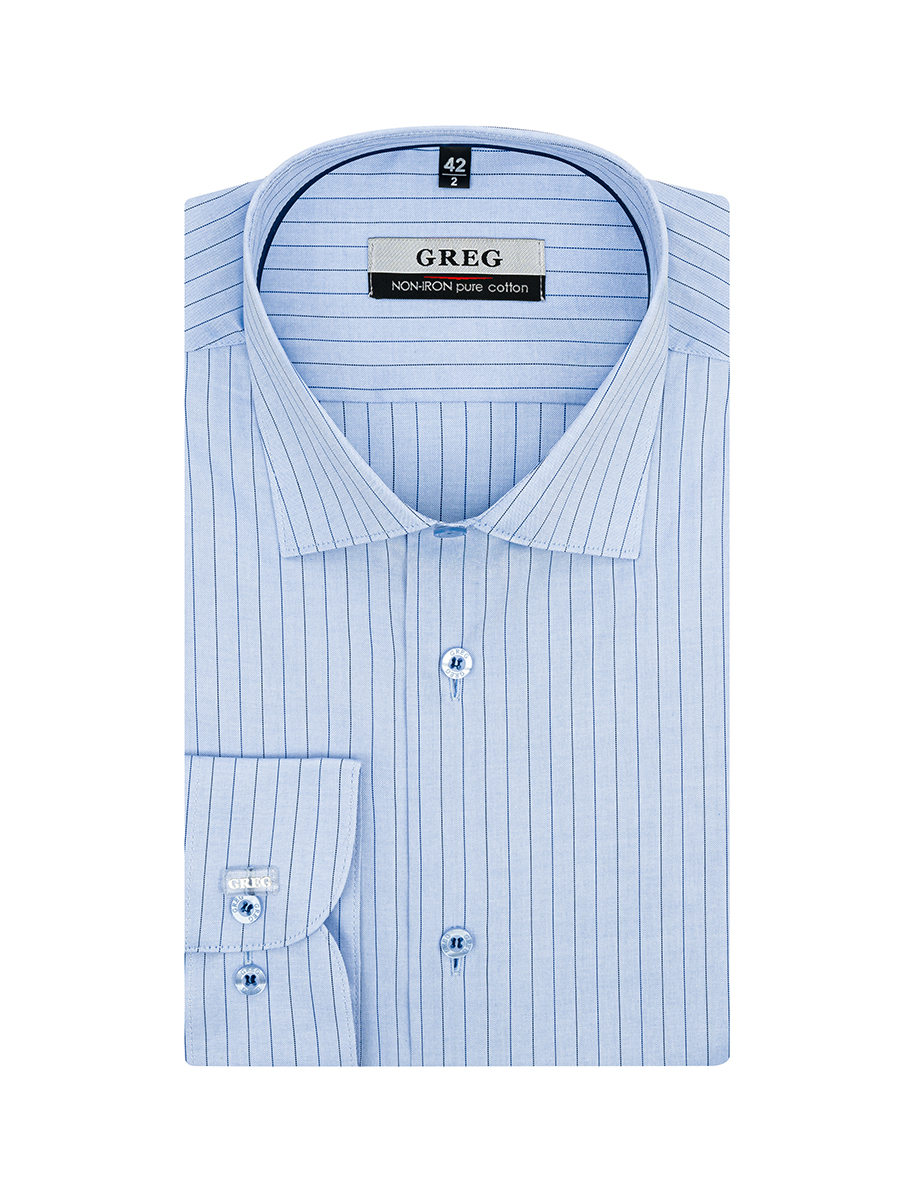 Цвет: Голубой Рисунок: Полоска..показатьi> Состав: 100% хлопок Non Iron Модель: Зауженная Ворот: Французский маленький Караман: отсутствует Манжет: универсальный закругленный на пуговицах и под запонки Силуэт: Полуприталенный силуэт / Regular fit Отделка: Сорочки- кант по нижнему краю внутренней стойки воротника из ткани компаньонаi>