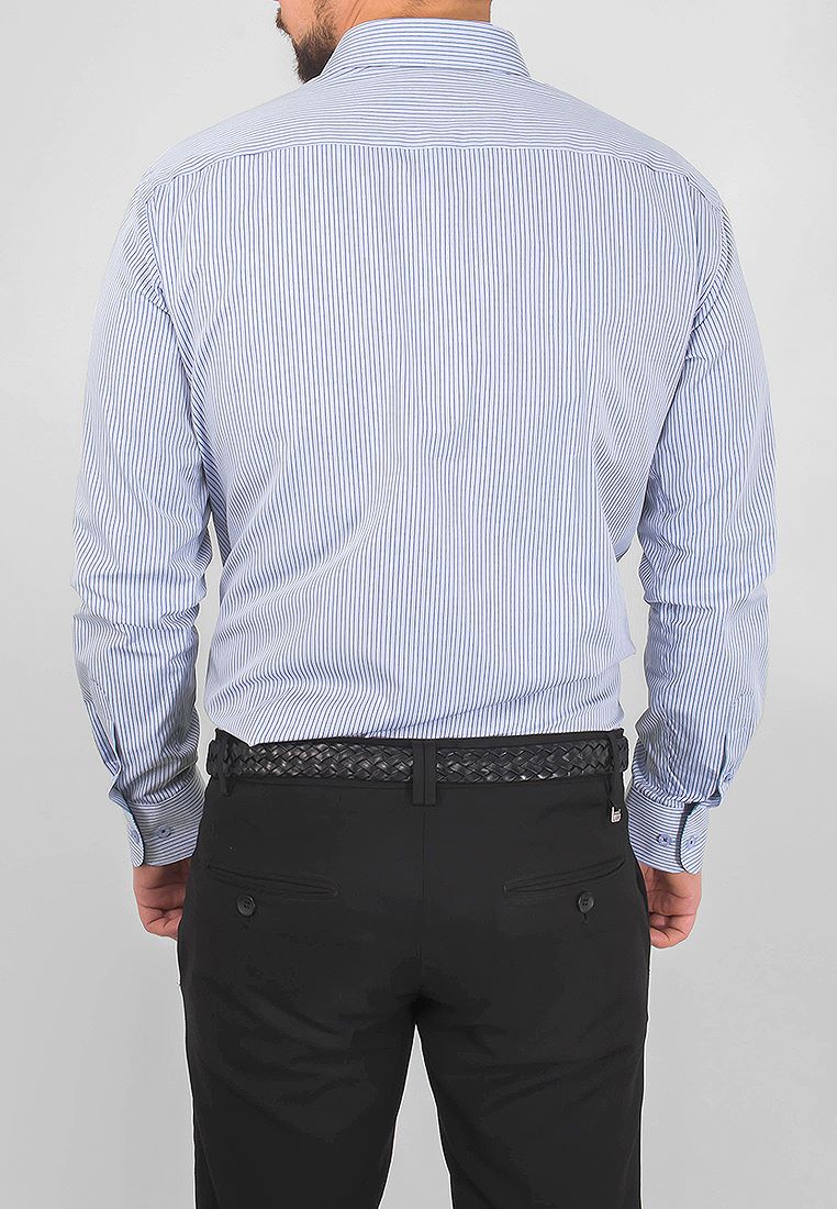Цвет: Голубой Рисунок: Полоска..показатьi> Состав: 100% хлопок Модель: Зауженная Ворот: Французский маленький Караман: отсутствует Манжет: универсальный закругленный на пуговицах и под запонки Силуэт: Полуприталенный силуэт / Regular fit Отделка: Сорочки- кант по нижнему краю внутренней стойки воротника и внутренний манжет из ткани компаньонаi>