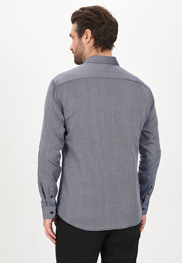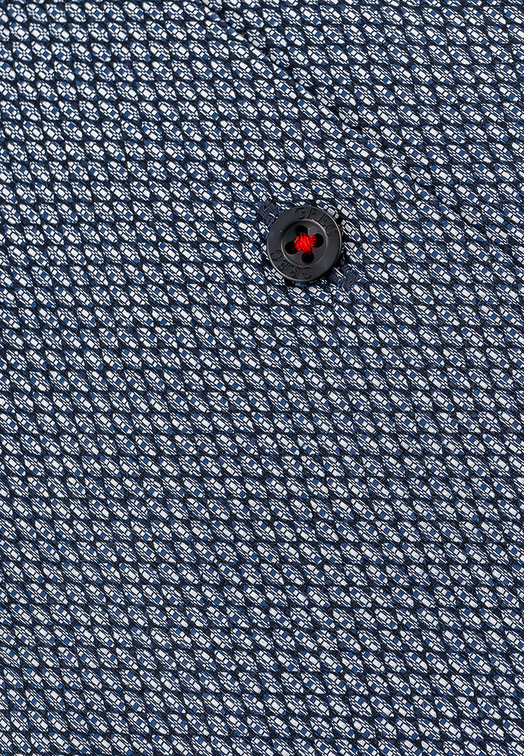 Цвет: Синий Рисунок: В мелкие эле..показатьменты Состав: 100% хлопок Easy Care Модель: Зауженная Ворот: Немецкий мягкий Караман: отсутствует Манжет: классический закругленный на пуговицах 6 см Силуэт: Полуприталенный силуэт / Regular fit Отделка: Сорочки- внутренняя стойка воротника и внутренний манжет из этой же ткани наизнанкументы