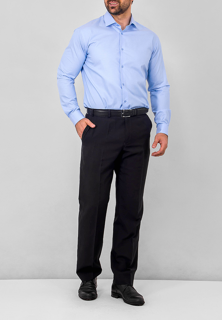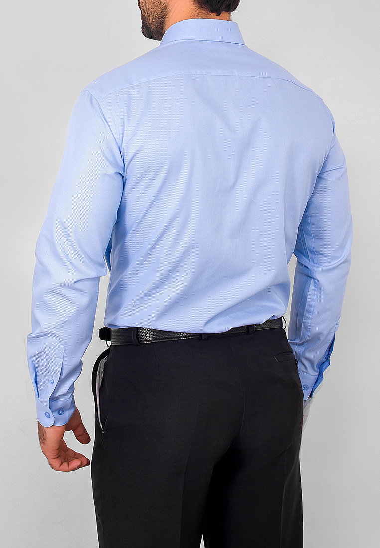 Цвет: Голубой Рисунок: Однотон с ..показатьфактурой Состав: 100% хлопок Модель: Зауженная Ворот: Французский маленький Караман: отсутствует Манжет: классический закругленный на пуговицах 6 см Силуэт: Полуприталенный силуэт / Regular fitфактурой