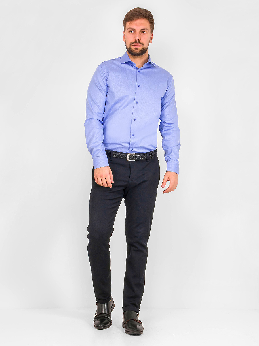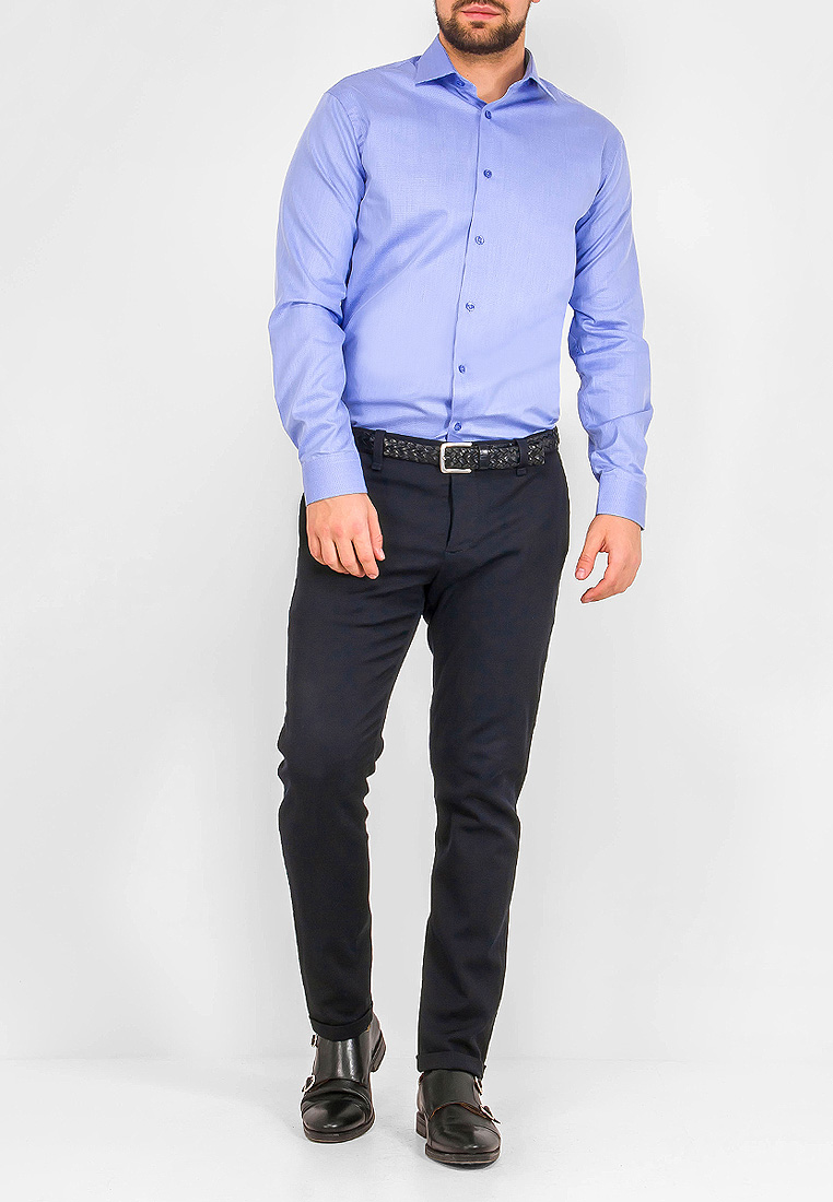 Цвет: Голубой Рисунок: Однотон с ..показатьфактурой Состав: 100% хлопок Модель: Зауженная Ворот: Французский маленький Караман: отсутствует Манжет: классический закругленный на пуговицах 6 см Силуэт: Полуприталенный силуэт / Regular fitфактурой