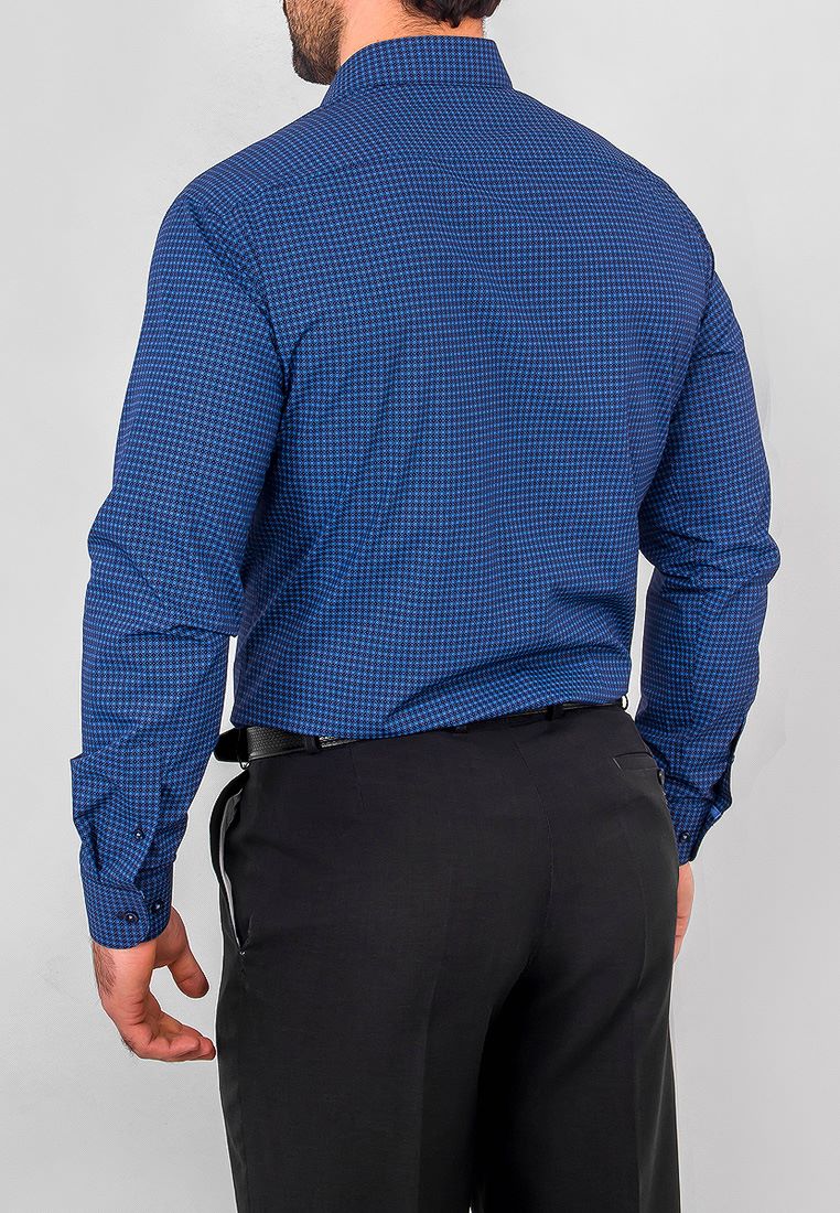 Цвет: Синий Рисунок: В мелкие эле..показатьменты Состав: 100% хлопок Модель: Зауженная Ворот: Французский маленький Караман: отсутствует Манжет: классический закругленный на пуговицах 6 см Силуэт: Полуприталенный силуэт / Regular fit Отделка: Сорочки- кант по нижнему краю внутренней стойки воротника и по внутреннему шву притачивания манжет именты