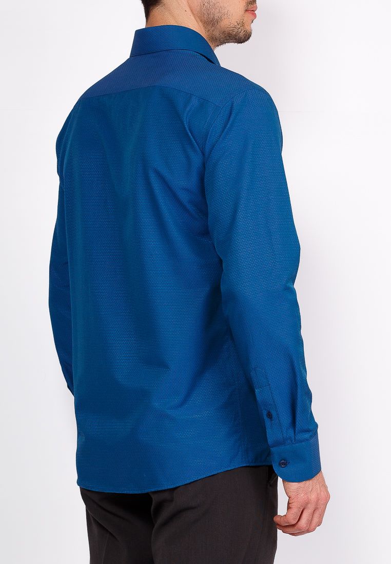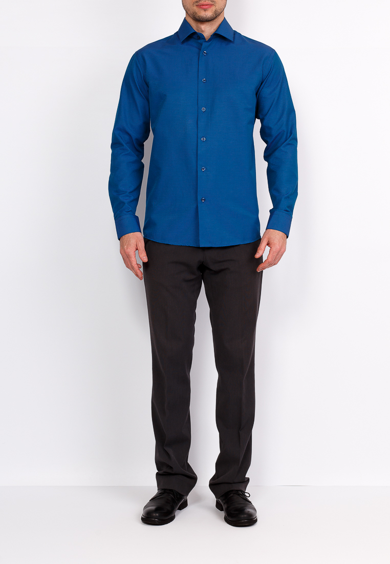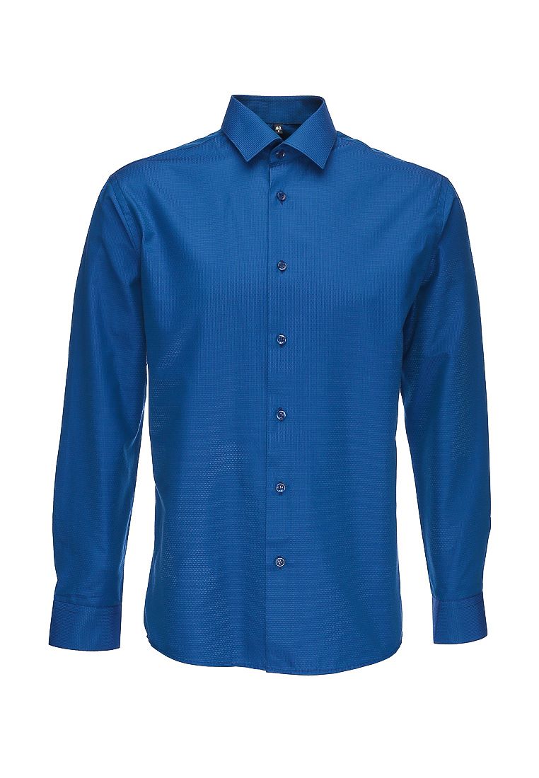 Цвет: Синий Рисунок: В мелкие эле..показатьменты Состав: 90% хлопок 10% полиэстер Модель: Зауженная Ворот: Французский маленький Караман: отсутствует Манжет: классический закругленный на пуговицах 6 см Силуэт: Полуприталенный силуэт / Regular fitменты