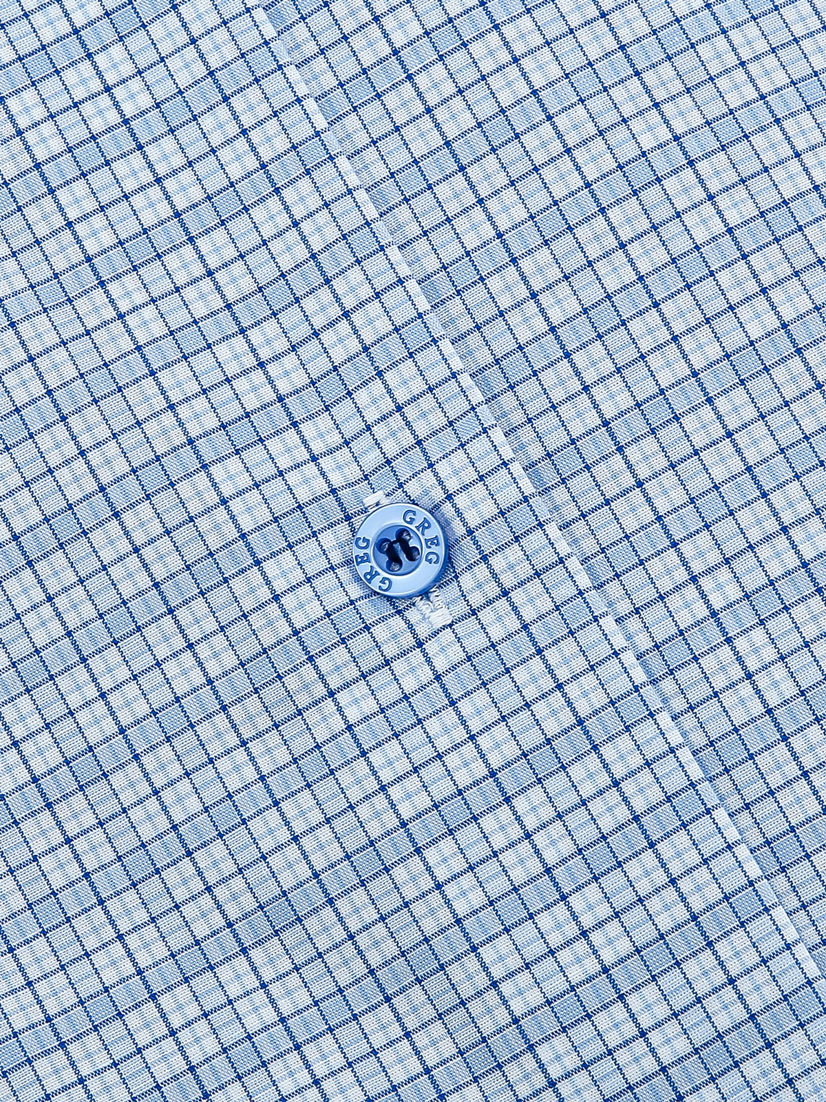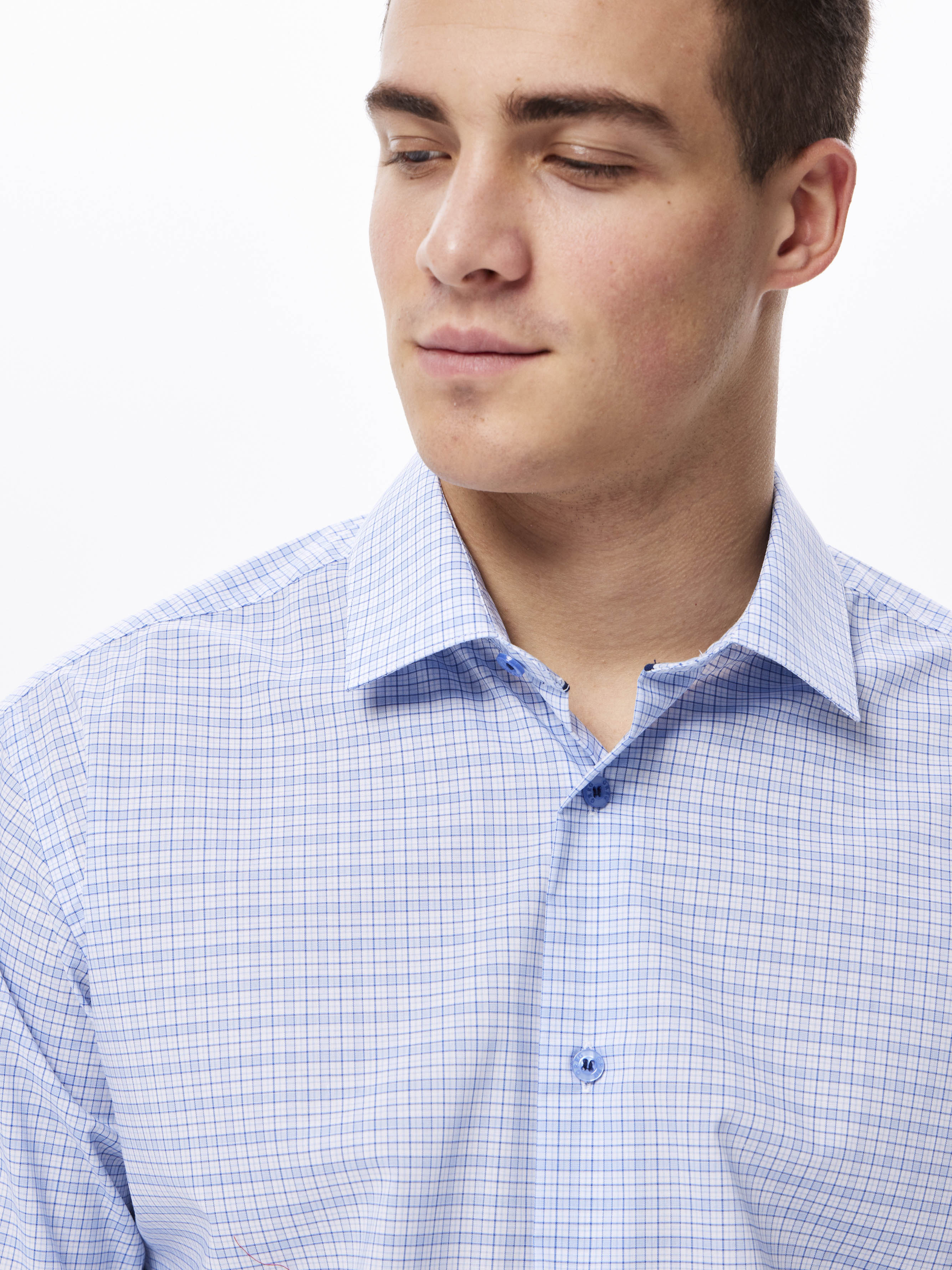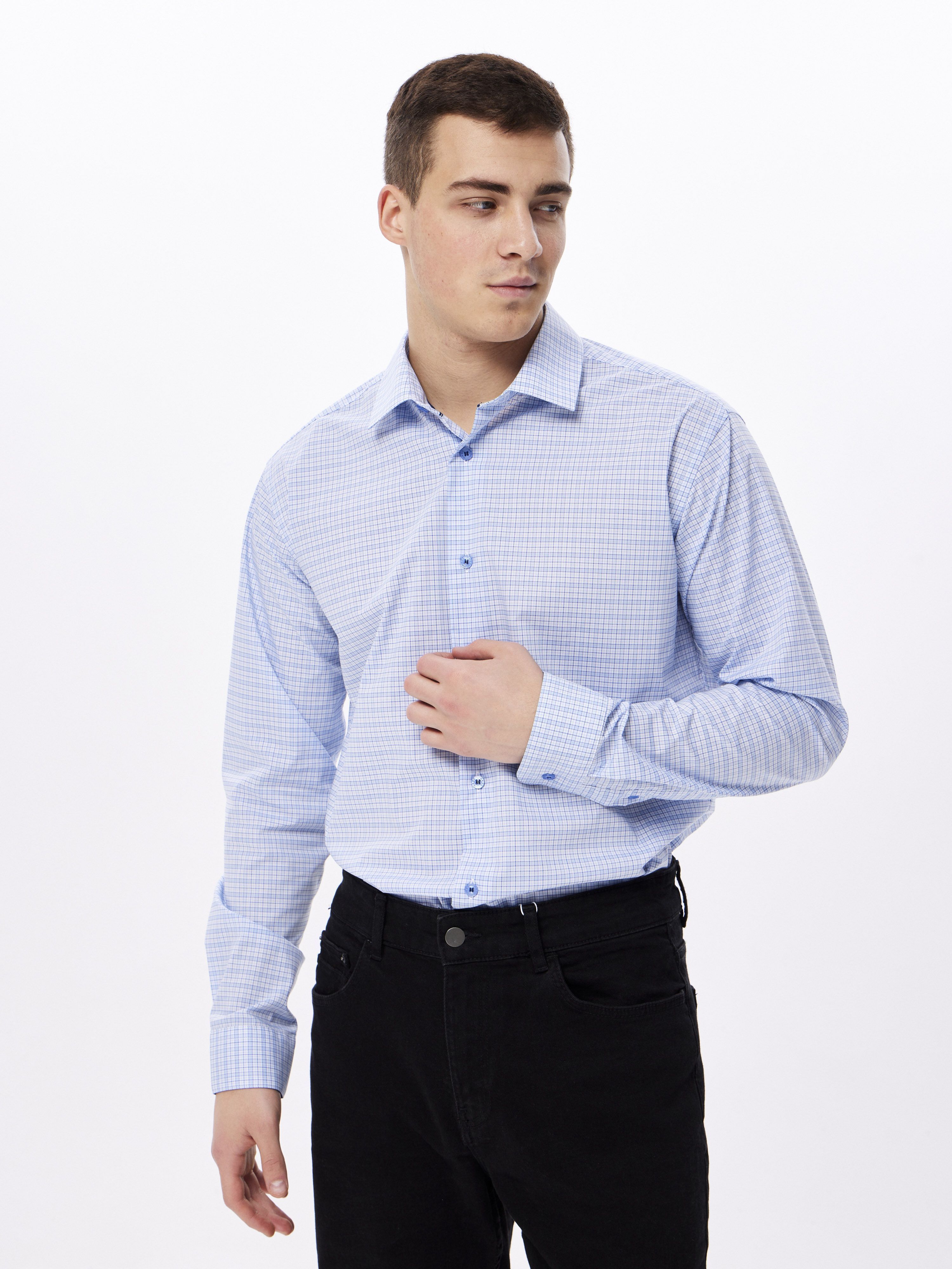 Цвет: Голубой Рисунок: Клетка..показать> Состав: 72% хлопок 24% нейлон 4% спандекс Модель: Зауженная Ворот: Немецкий Караман: отсутствует Манжет: классический закругленный на пуговицах 6 см Силуэт: Полуприталенный силуэт / Regular fit Отделка: Сорочки- кант по нижнему краю внутренней стойки воротника и внутренний манжет из ткани компаньона>