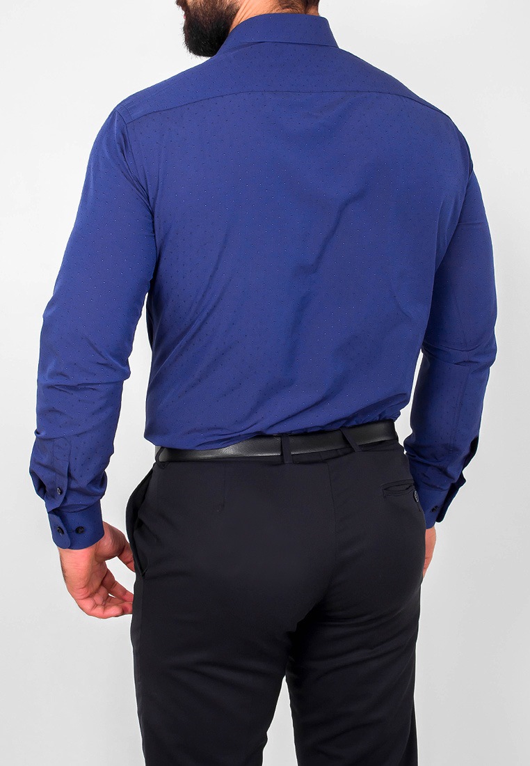 Цвет: Синий Рисунок: В мелкие эле..показатьменты Состав: 90% хлопок 10% полиэстер Модель: Зауженная Ворот: Французский маленький Караман: отсутствует Манжет: универсальный закругленный на пуговицах и под запонки Силуэт: Полуприталенный силуэт / Regular fitменты
