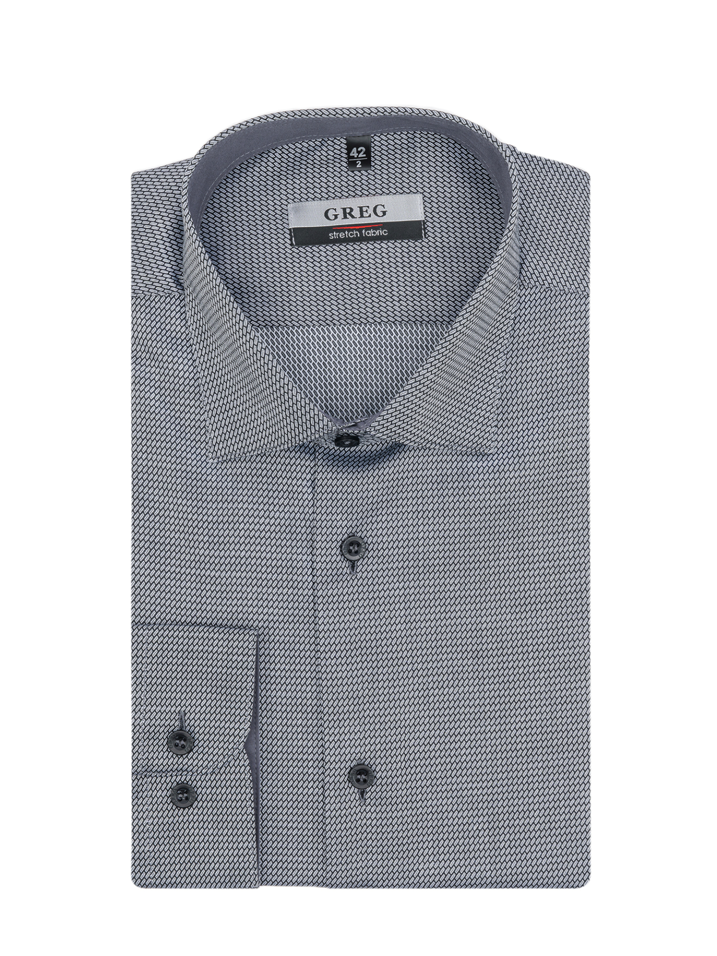 Цвет: Серый Рисунок: В мелкие эле..показатьменты Состав: 97% хлопок 3% лайкра Модель: Зауженная Ворот: Французский маленький Караман: отсутствует Манжет: классический закругленный на пуговицах 6 см Силуэт: Полуприталенный силуэт / Regular fit Отделка: Сорочки- внутренняя стойка воротника и внутренний манжет из ткани компаньонаменты