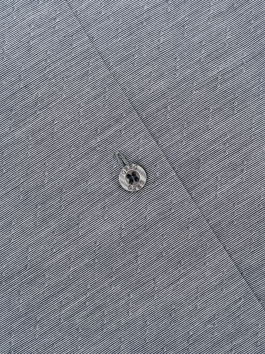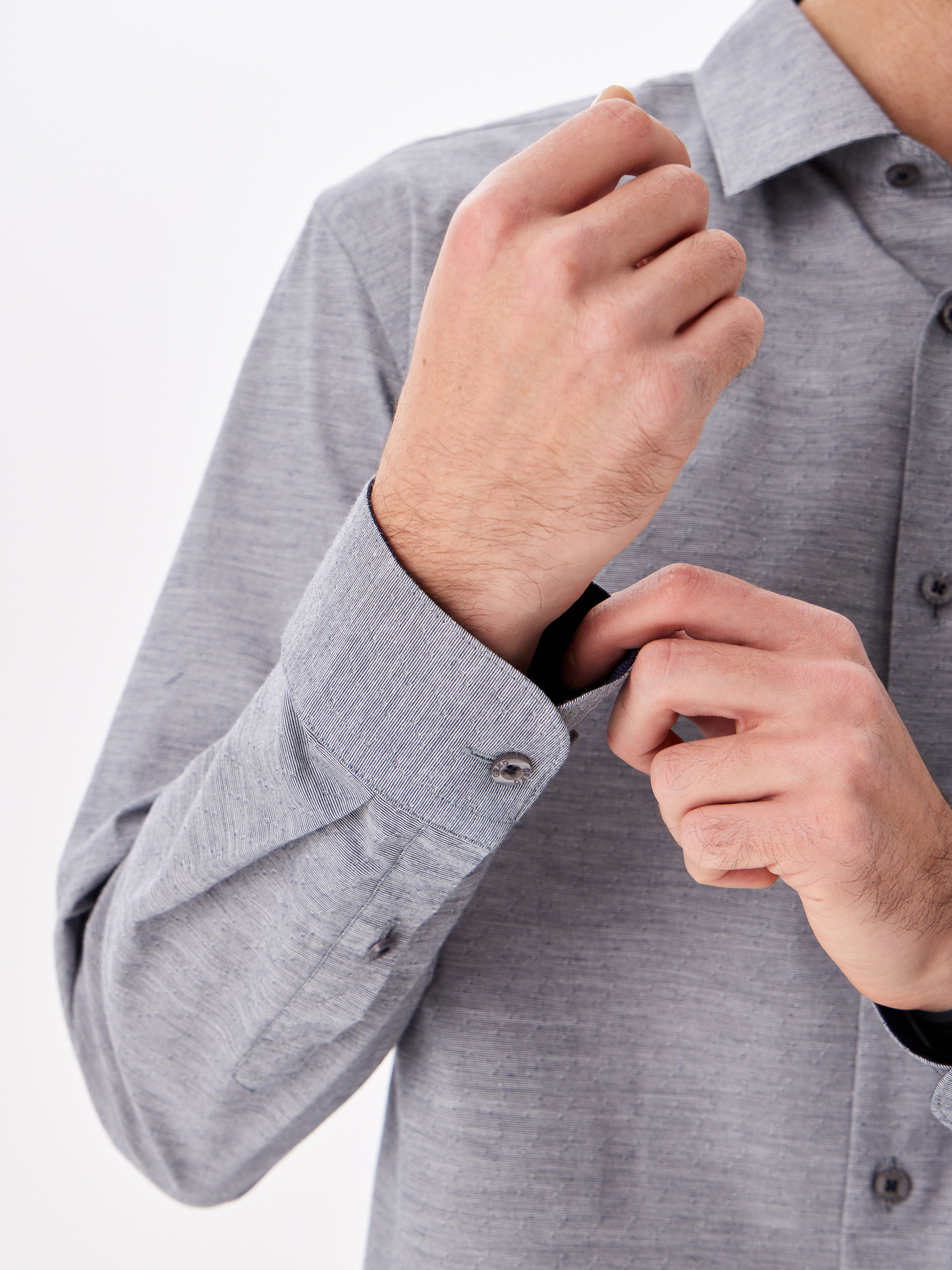 Цвет: Серый Рисунок: В мелкие эле..показатьменты Состав: 97% хлопок 3% лайкра Модель: Прилегающая Ворот: Немецкий Караман: отсутствует Манжет: классический закругленный на пуговицах 6 см Силуэт: Прилегающий силуэт / Super Slim fit Отделка: Сорочки- внутренняя стойка воротника и внутренний манжет из ткани компаньонаменты