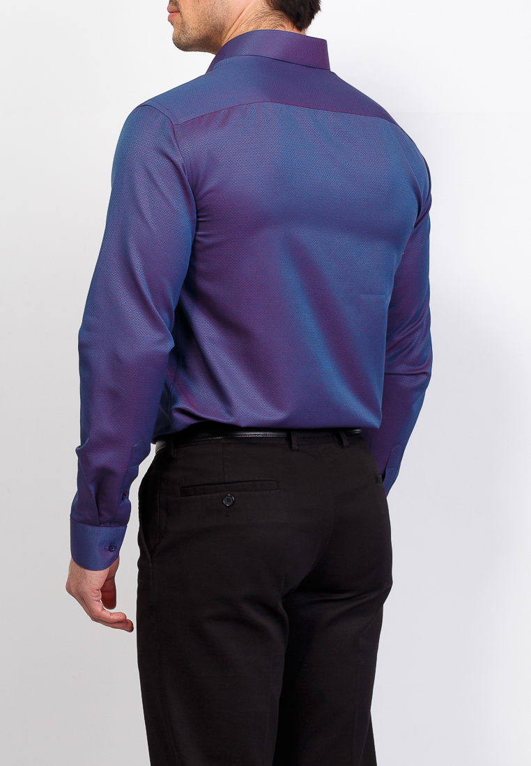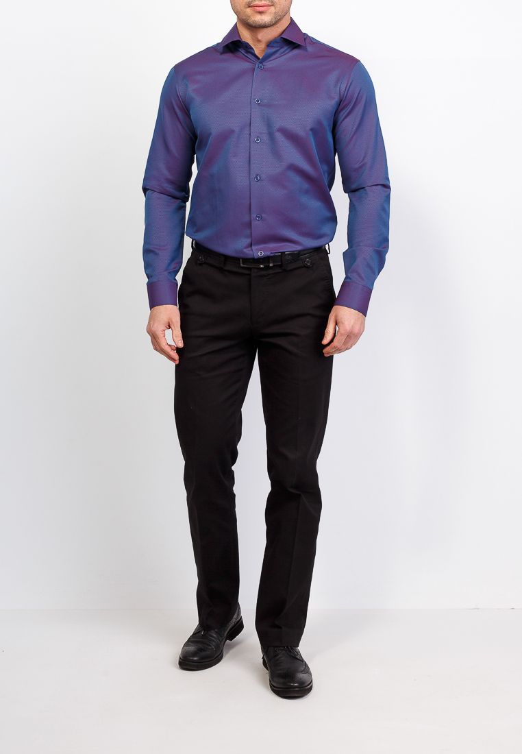 Цвет: Фиолетовый Рисунок: Однотон..показать с фактурой Состав: 90% хлопок 10% полиэстер Модель: Зауженная Ворот: Французский маленький Караман: отсутствует Манжет: классический закругленный на пуговицах 6 см Силуэт: Полуприталенный силуэт / Regular fit с фактурой