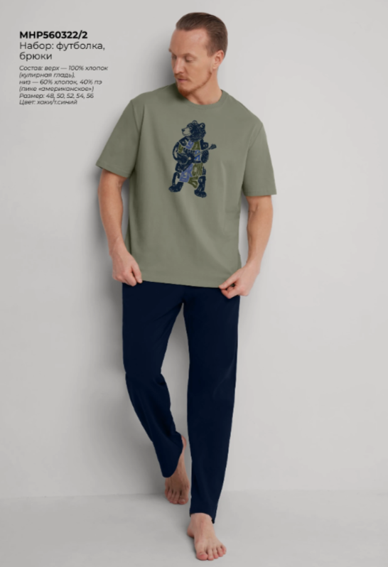 "Описание: Набор мужской состоящий из футболки и брюк. Футболка из кулирной глади с округлым вырезом горловины и дизайнерским принтом. Брюки из фактурного полотна - пике на широком поясе с резинкой и регулируемым шнуром, по бокам удобные карманы.