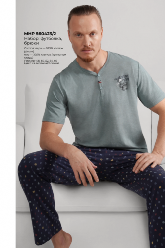 "Описание: Набор мужской состоящий из футболки и брюк. Футболка из фактурного полотна флам с декоративной планкой на пуговицы и с дизайнерским принтом. Брюки из плотной кулирной глади в мелкую графику на эластичном поясе с функциональными карманами и шнуром.