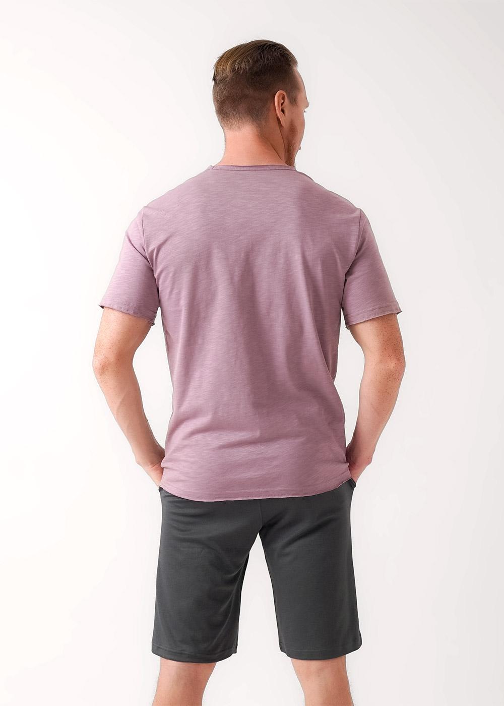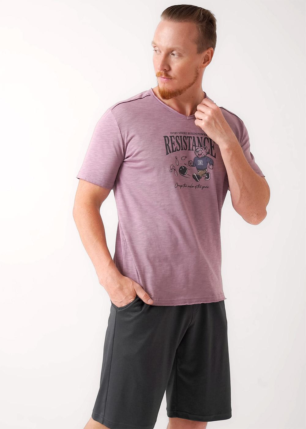 "Описание: Набор для дома состоящий из футболки и шорт. Футболка из фактурного полотна флам с V-образным вырезом горловины, коротким рукавом и дизайнерским принтом. Шорты из фактурного полотна пике на эластичном поясе с функциональными карманами и шнуром.