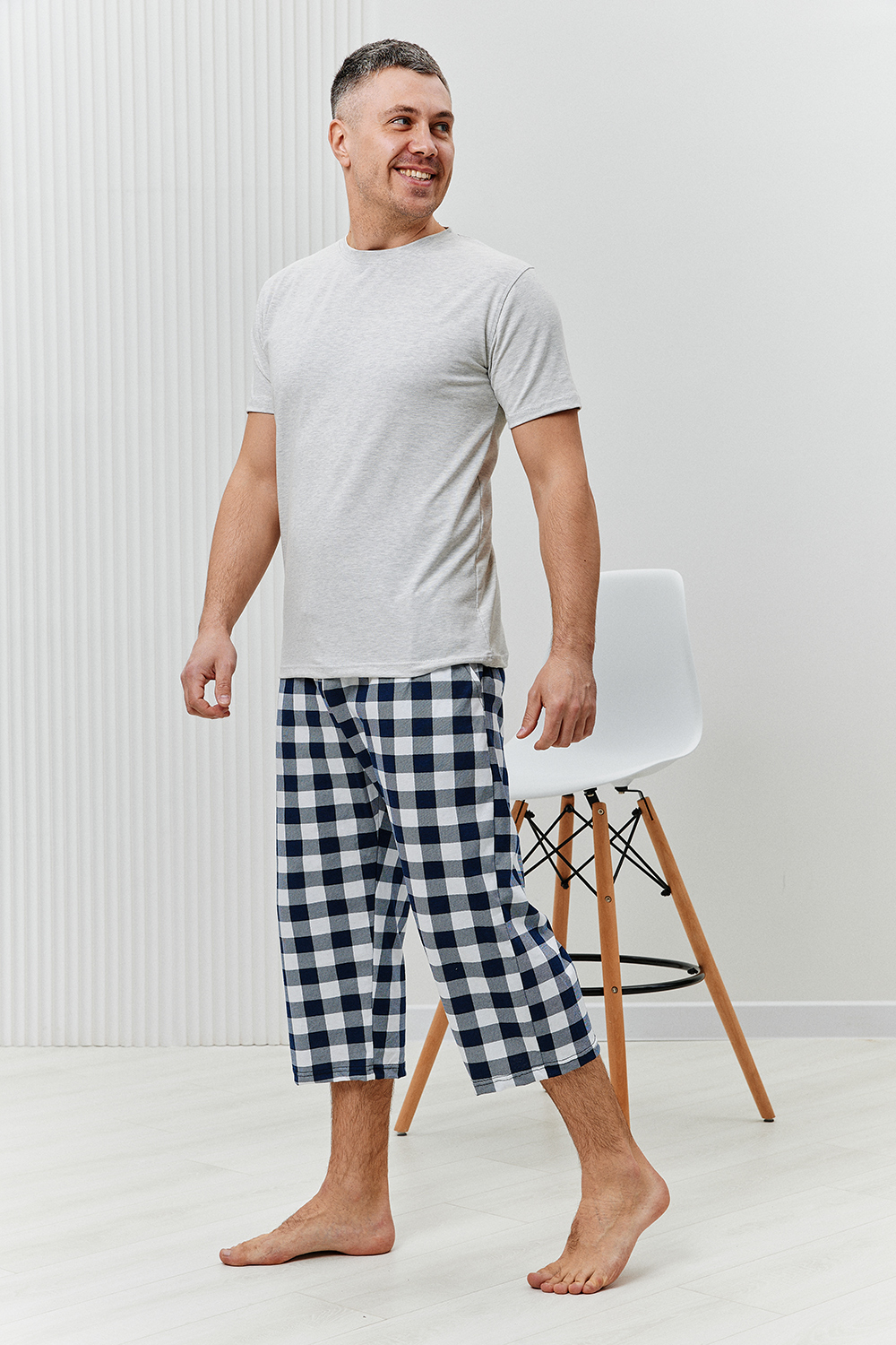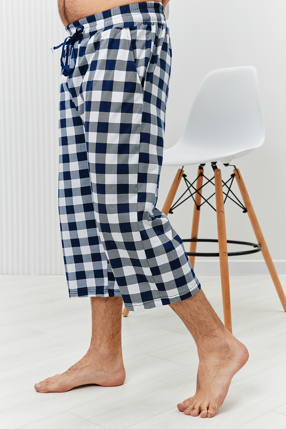 Бермуды мужские выполнены из кулирки 100% хлопок в клетку с карманами в боках, на поясе со шнурком. Они идеально подойдут как для дома, так и для прогулок и отдыха. Цвет: синий, белый; Материал: кулирка;кулирка; Состав: хлопок 100%.
