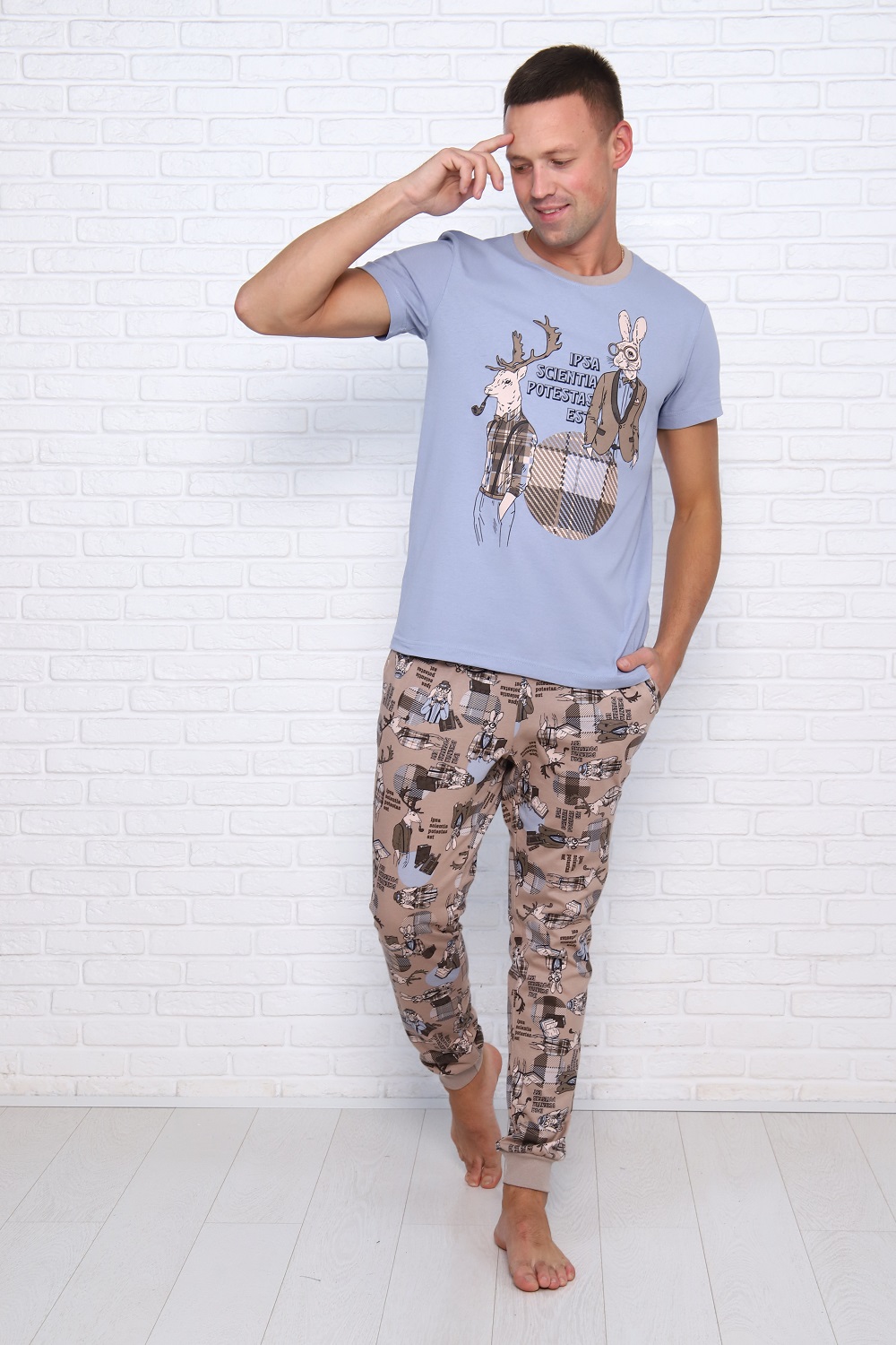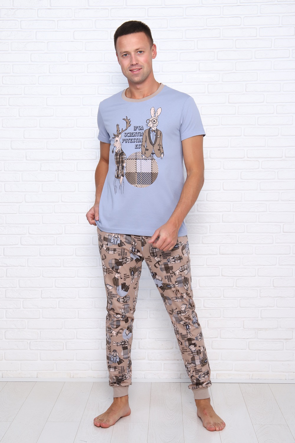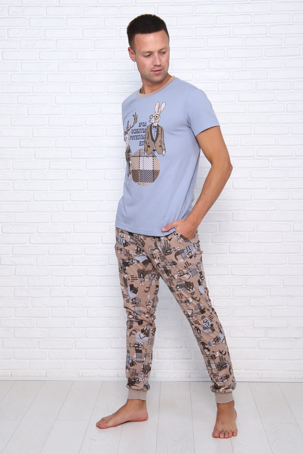 Пижама мужская: брюки с боковыми карманами, заужены к низу, манжет из рибаны; футболка с коротким рукавом и со стильной печатью на груди. Цвет: темно-бежевый; Материал: кулирка;кулирка; Состав: хлопок 100%.