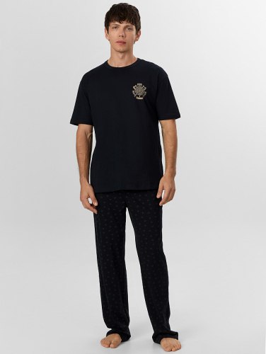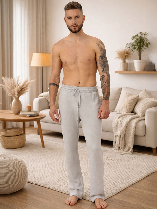 Мужские домашние брюки прямого кроя созданы для максимального комфорта в повседневной носке. Классическая линия талии с отрезным поясом и широкой эластичной тесьмой внутри обеспечивает мягкую фиксацию без давления. На передней части пояса добавлены функциональные петли с шнуром-бейкой — это позволяет регулировать посадку под индивидуальные предпочтения.