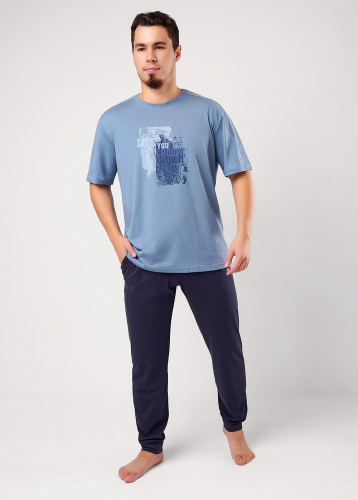 "Описание: Набор мужской состоящий из футболки и брюк. Футболка из хлопковой кулирной глади с добавлением эластана с коротким рукавом и минималистичным принтом. Брюки из фактурного полотна -пике, на широком поясе с резинкой и шнуром, по бокам удобные карманы.