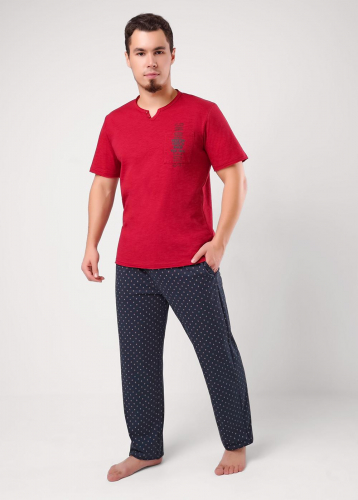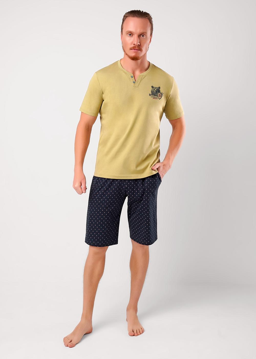 "Описание: Набор мужской для дома состоящий из футболки и шорт. Футболка из кулирной глади с фигурной горловиной, коротким рукавом и принтом. Шорты из набивной кулирной глади на эластичном поясе с функциональными карманами и шнуром.
