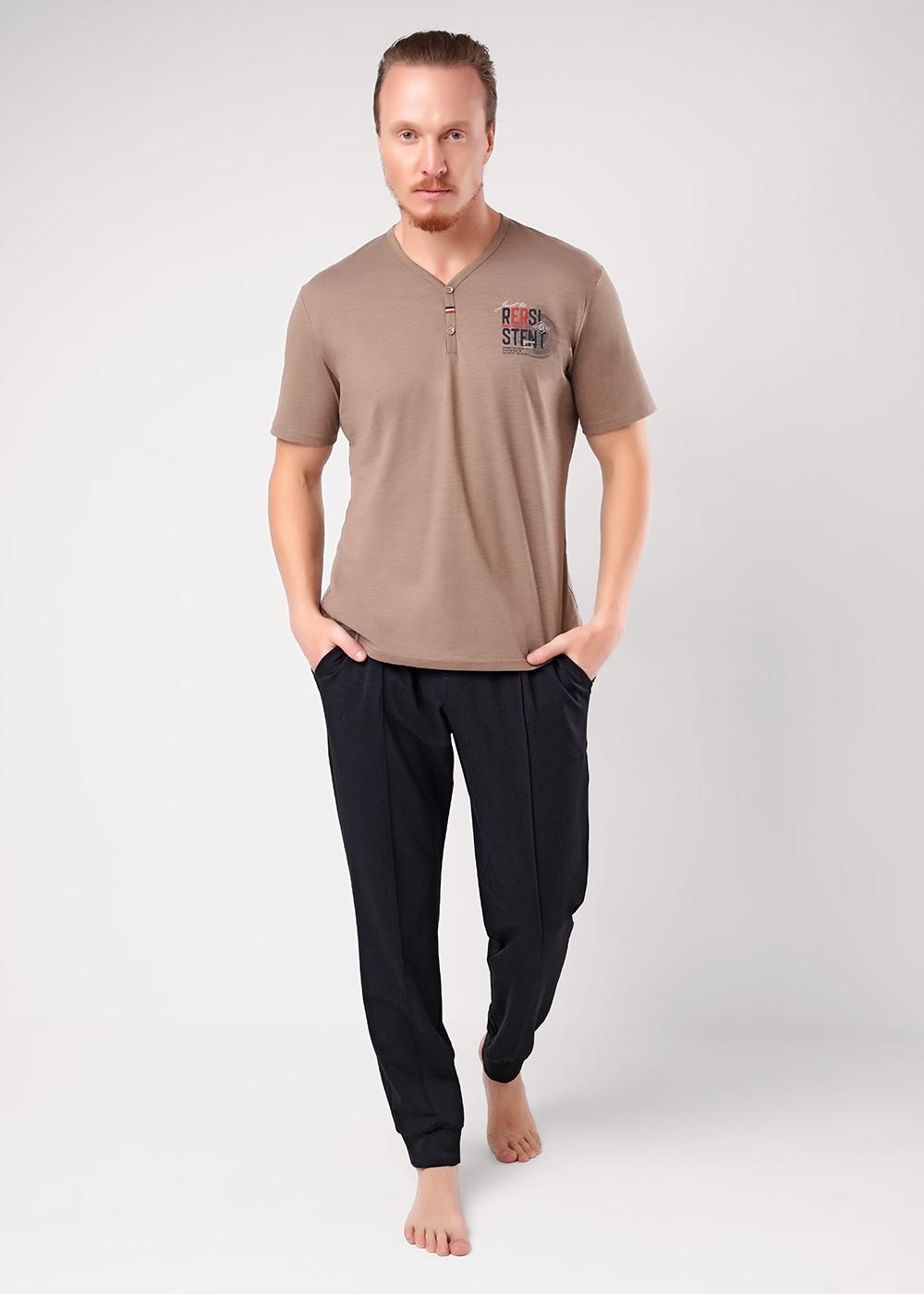 "Описание: Набор, состоящий из футболки и брюк. Футболка из хлопкового фактурного полотна - флам, с коротким рукавом, имитацией планки, спереди авторский принт. Брюки из плотной кулирной глади на поясе с резинкой и регулируемым шнуром, по бокам удобные карманы.