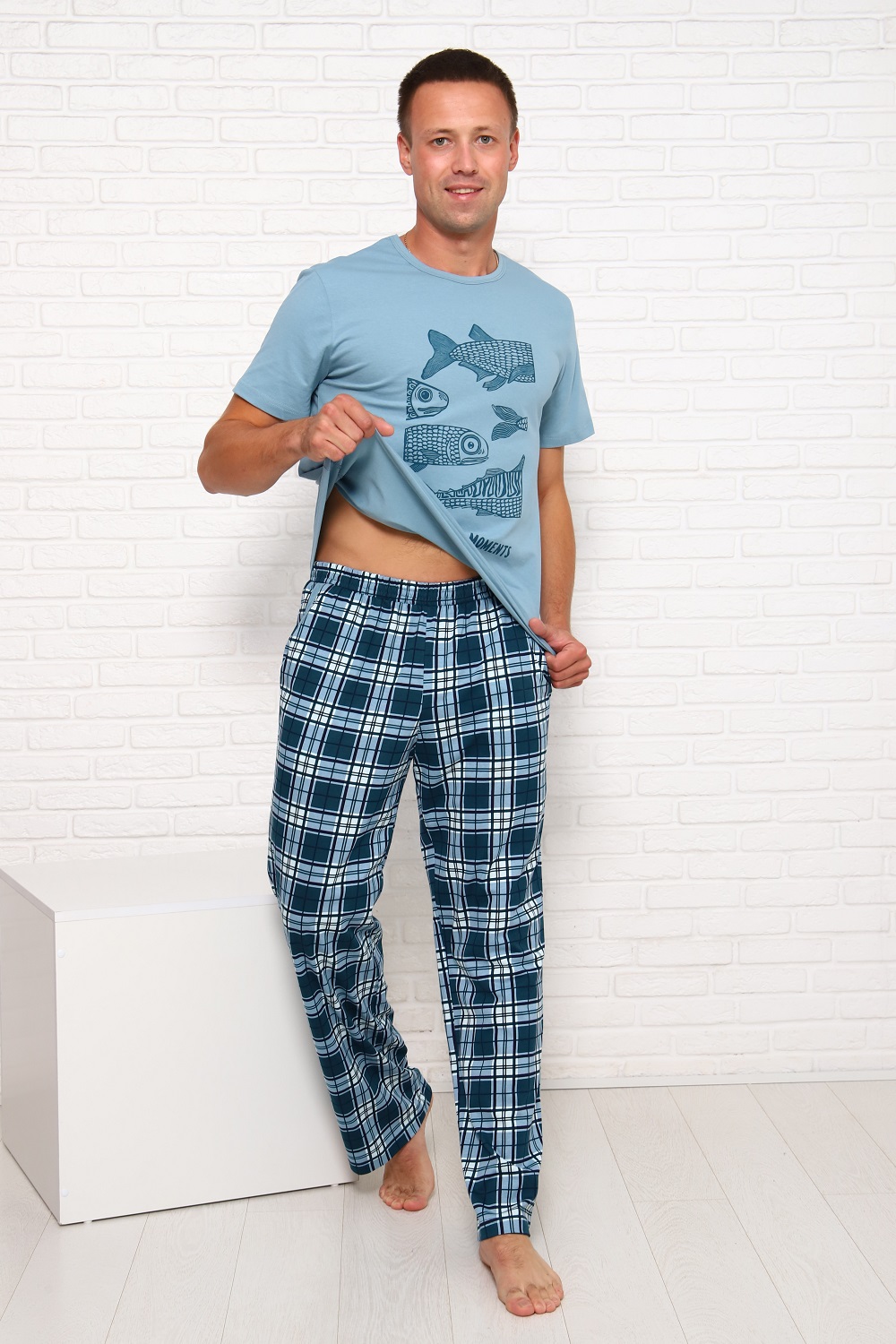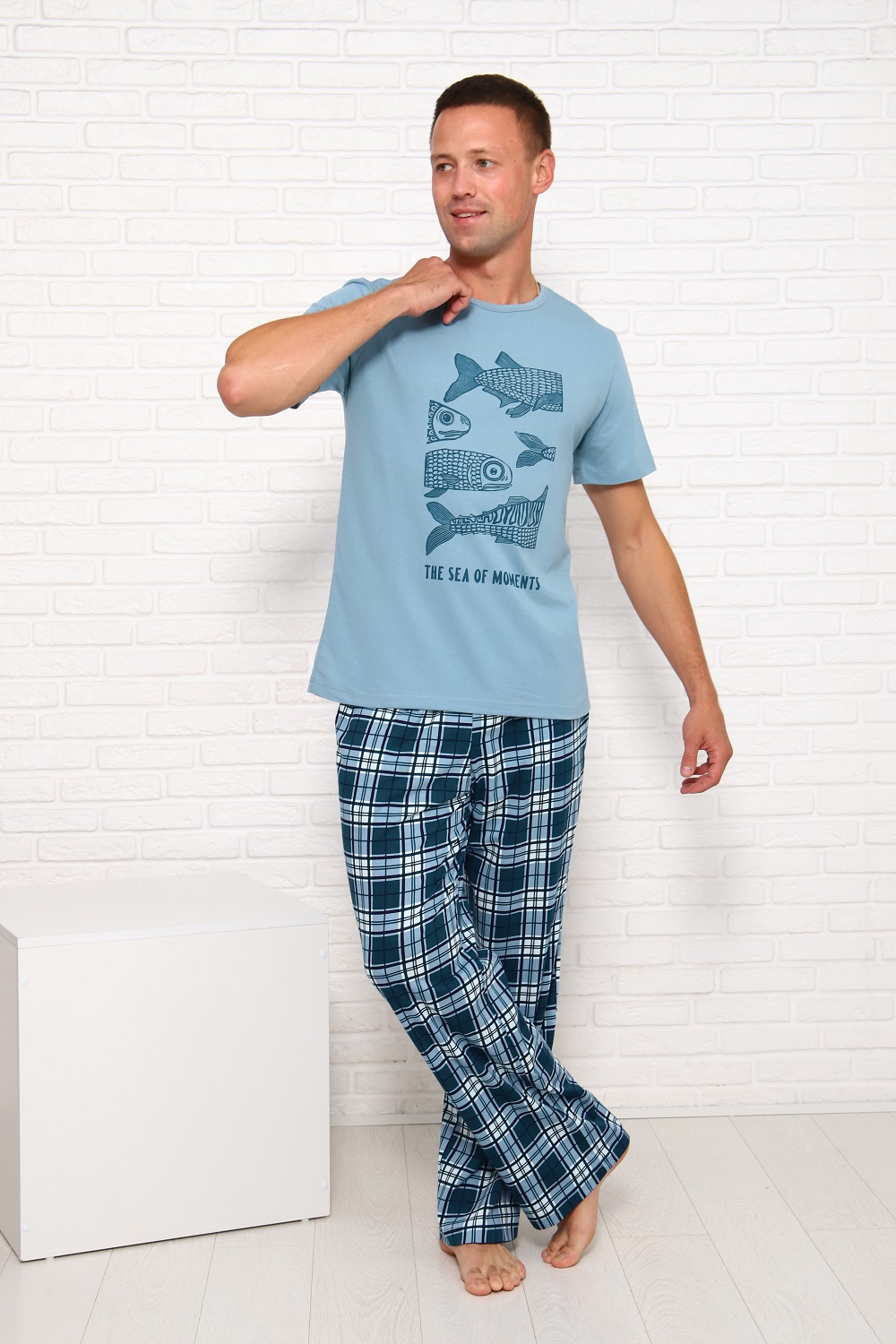 Пижама мужская: футболка с короткими рукавами и оригинальным принтом на груди, брюки с боковыми карманами в швах. Комфорт 100%-ого хлопкового трикотажа. Цвет: голубой; Материал: кулирка;кулирка; Состав: 100% Хлопок.