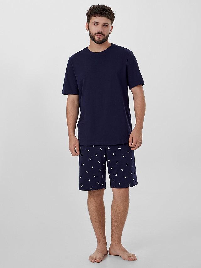 Синяя мужская пижама из хлопка — это идеальный комплект для комфортного сна и отдыха. В набор входит футболка прямого силуэта и прямые шорты. Футболка с круглой горловиной и короткими рукавами обеспечивает удобство и свободу движений. Горловина обработана эластичной резинкой, которая хорошо держит форму.