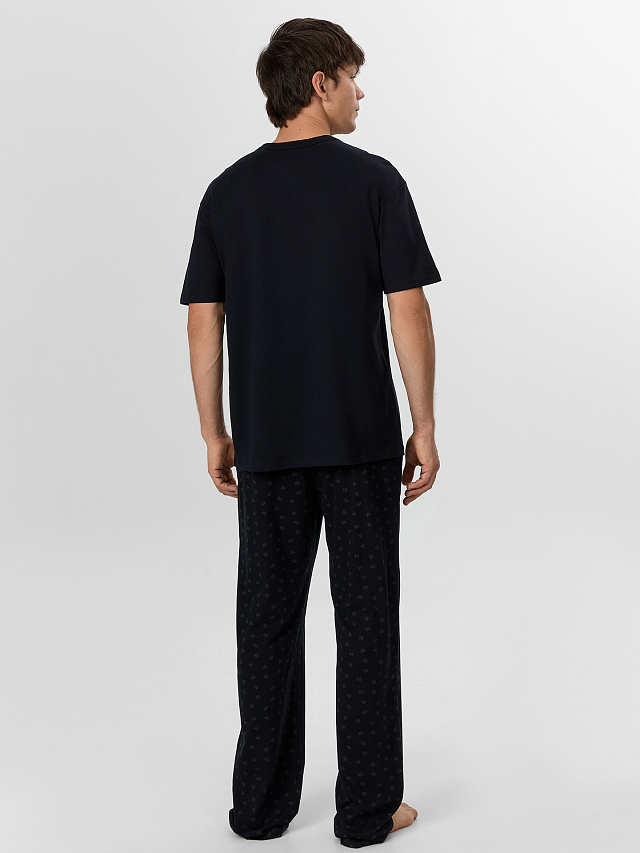 Комплект мужской домашний черный — это уютный набор для отдыха, созданный из мягкой трикотажной кулирки. Футболка свободного силуэта с круглой горловиной и удлиненными рукавами до локтя обеспечивает полную свободу движений. Спущенное плечо и аккуратная обработка швов исключают дискомфорт.