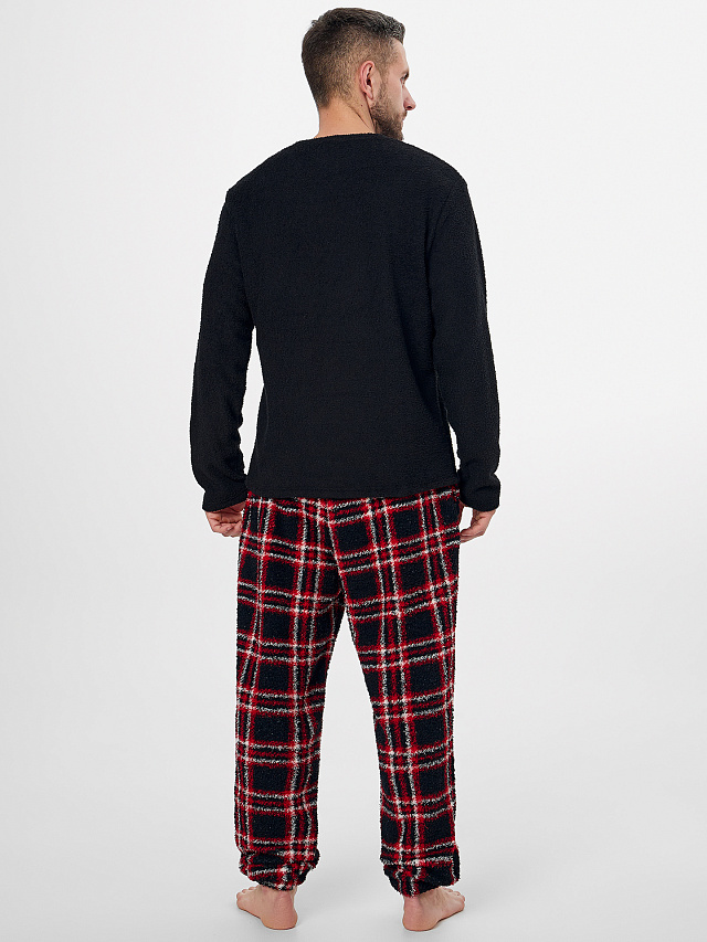Комплект состоит из джемпера и брюк. Комплект мужской из трикотажного полотна с меховым ворсом 280 гр/м2. Джемпер свободного силуэта. Горловина округлой формы, обработана обтачкой из основного полотна. Рукава втачные. Нижние срезы обработны швом в подгибку на двухигольной плоскошовной машине. Брюки свободного силуэта, с классической линией талии. Пояс цельнокроенный с эластичной тесьмой внутри 30 мм. В боковых швах обработаны карманы. Нижние срезы брюк обработаны швом в подгибку с эластичной тесьмой внутри 30 мм.