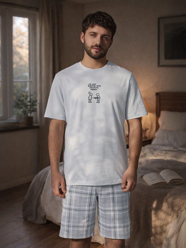 Мужской домашний комплект серого цвета с надписью "Я просто переполнен саркастической энергией" - сочетает в себе сдержанный стиль и продуманный комфорт. Надпись с ироничным посылом добавляет образу индивидуальности и чувства юмора.