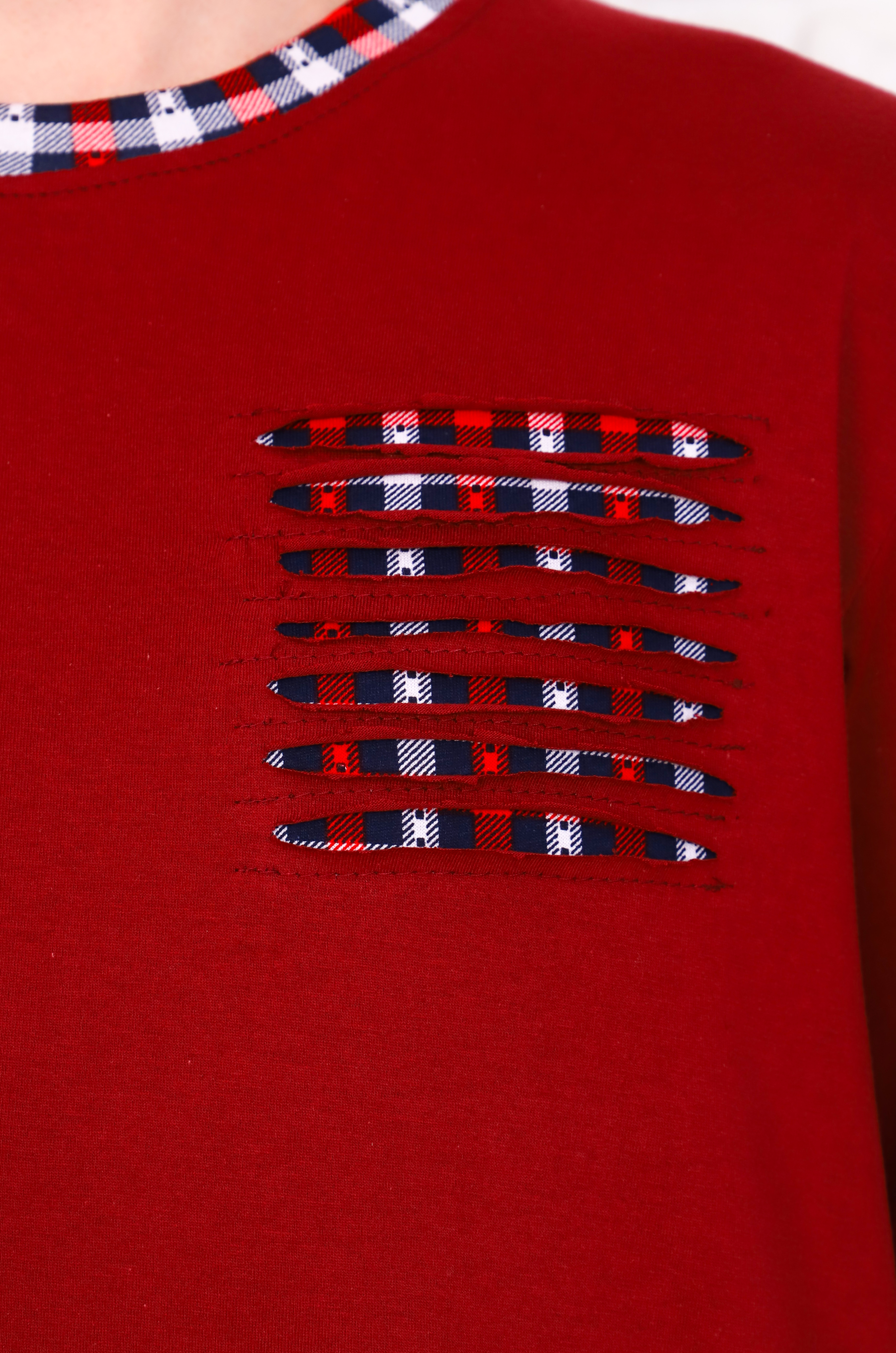 Брюки зауженные с боковыми карманами, пояс на резинке, футболка с длинным рукавом прямого кроя, горловина и рукава окантованы в тон брюк, на полочке декоративная деталь.