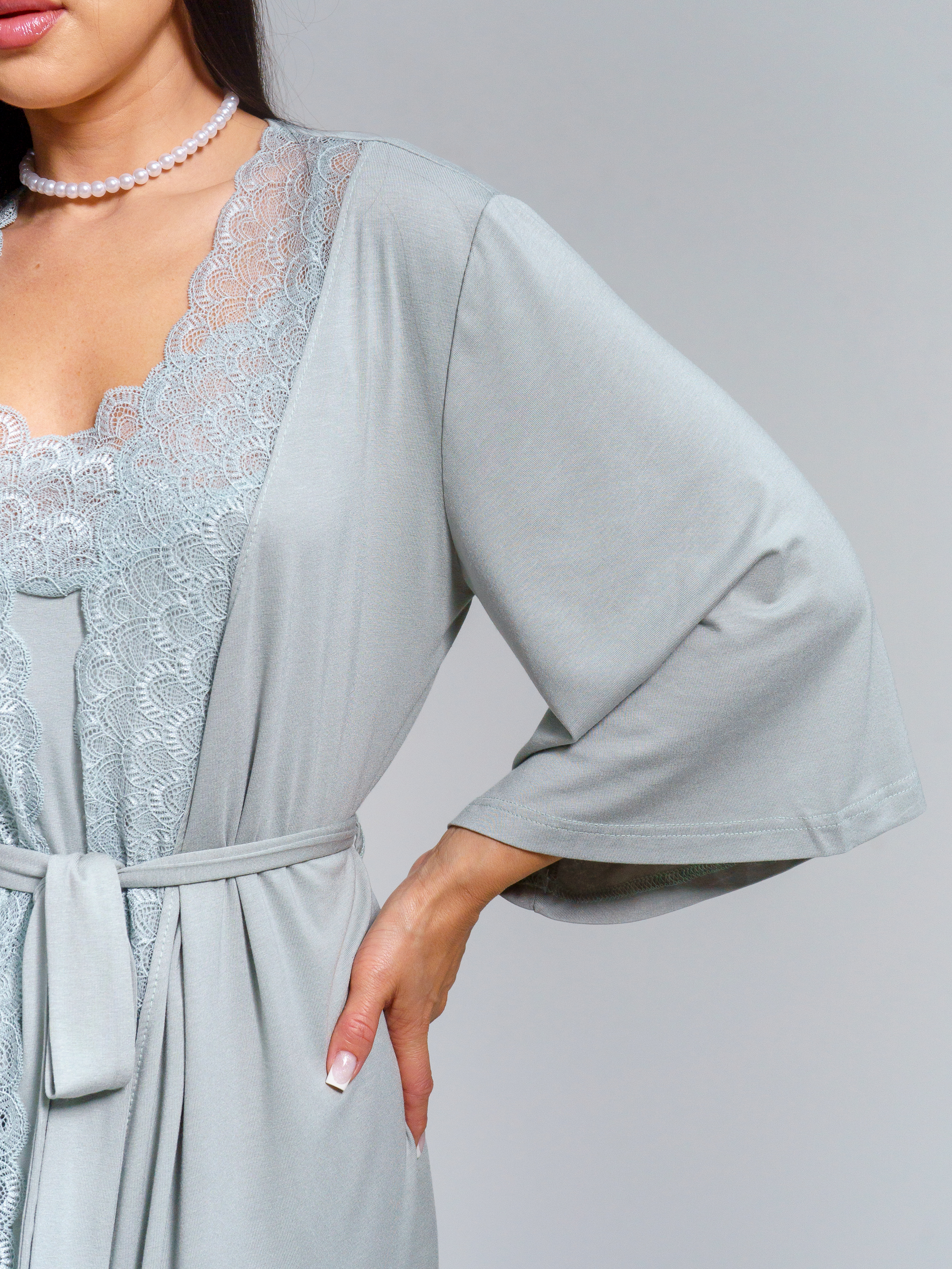 Женственная сорочка на бретелях с ажурным кружевом на груди.
