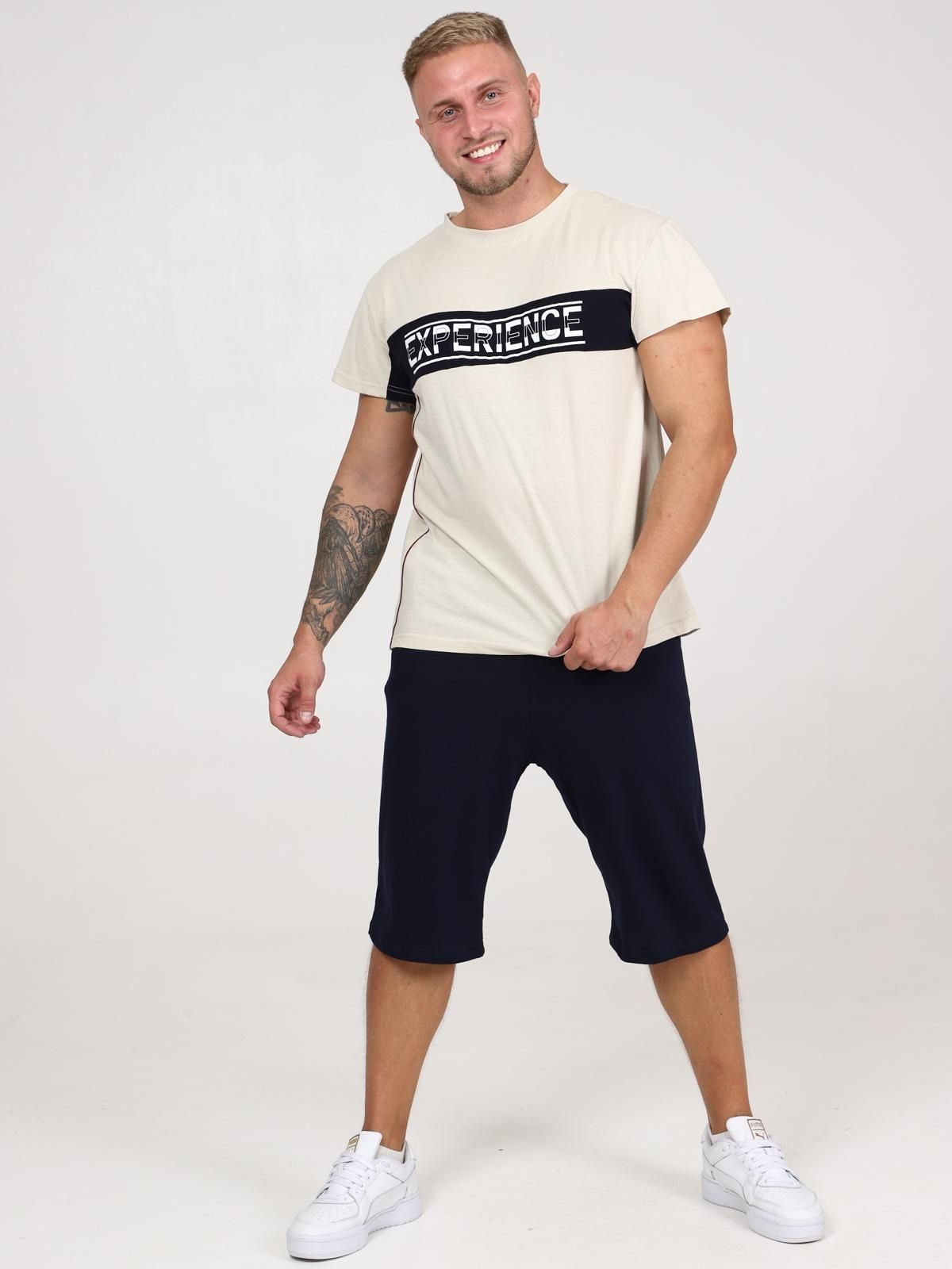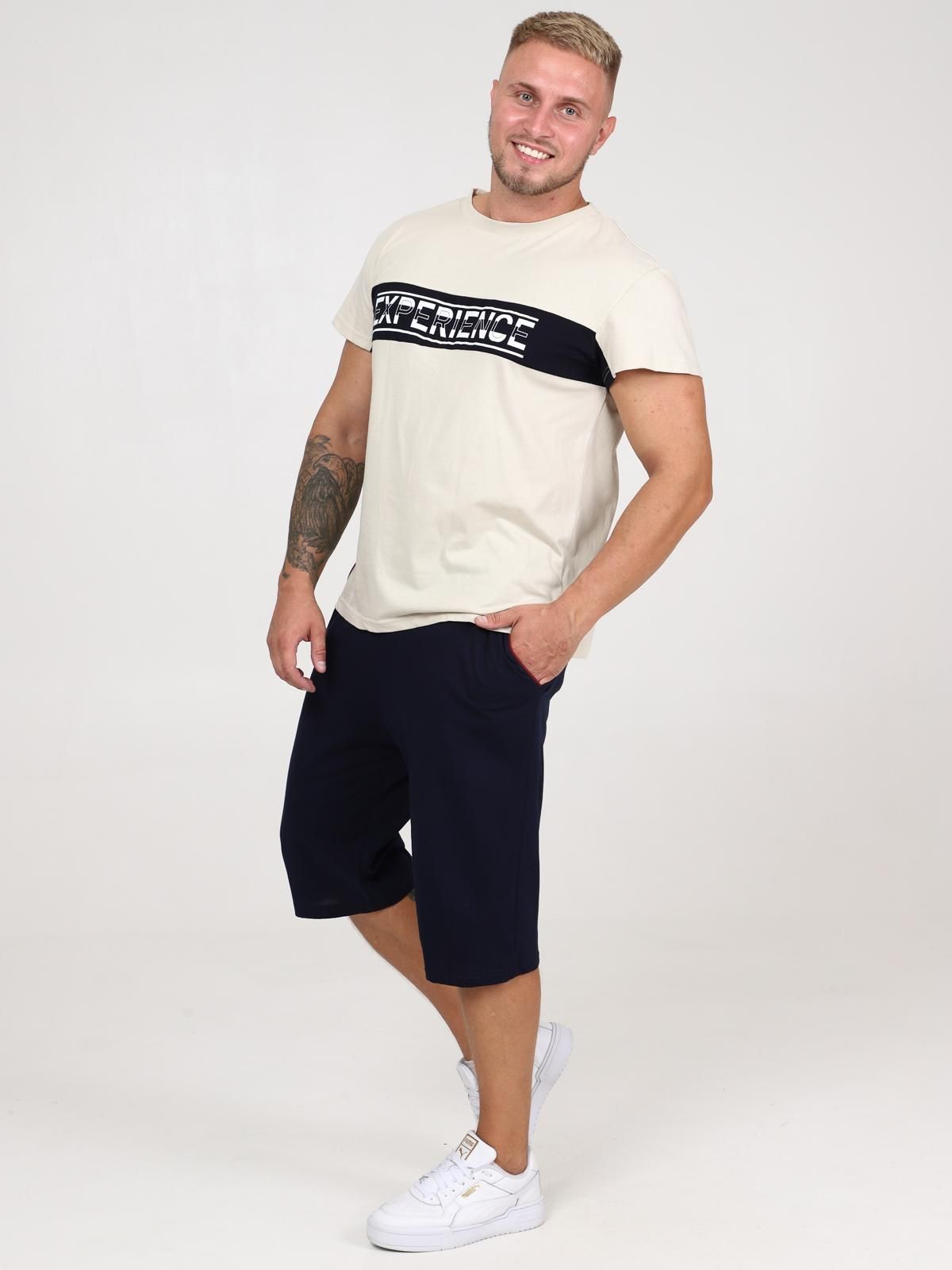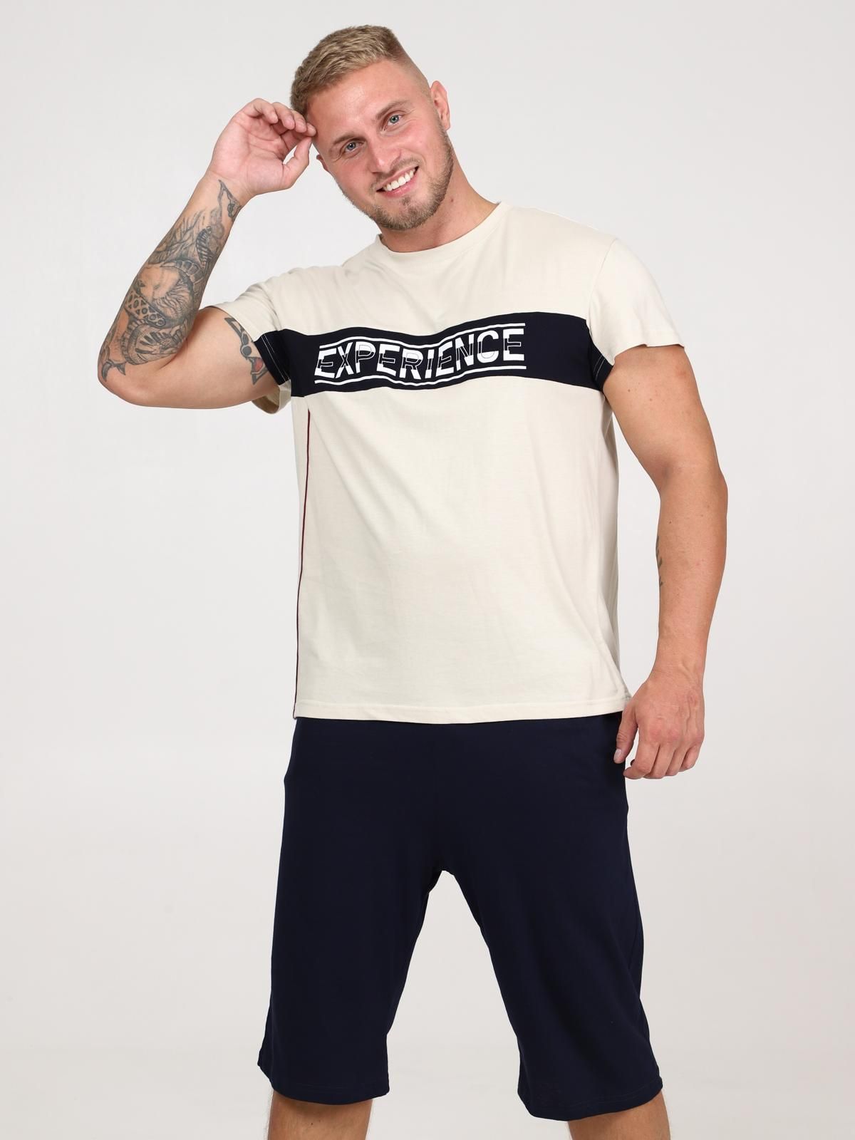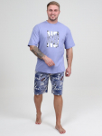 Комфортная легкая мужская пижама из качественного хлопка. Футболка прямого силуэта,с коротким рукавом, отделана декоративным кантом и вставкой с принтом. Шорты прямого кроя ниже колен с карманами. Модель для повседневной носки из натуральной дышащей ткани.