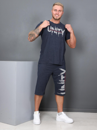Пижама состоит из футболки и брюк. При пошиве использовано трикотажное полотно- кулирка. Футболка мужская с втачным коротким рукавом. На полочке — принт «Revolution». Горловина обработана обтачкой в цвет изделия. Низ рукава и низ изделия обработаны швом в подгибку.