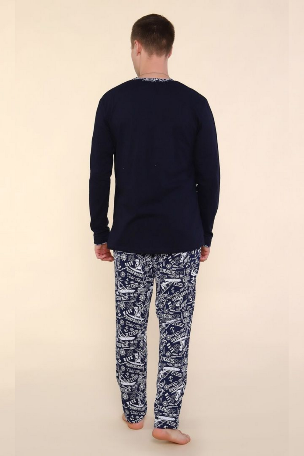Этот мужской комплект домашней одежды состоит из темно-синей футболки с длинным рукавом и пестрых свободных брюк, выполненных из натурального 100% хлопка. Комплект разработан для обеспечения максимального комфорта и имеет широкий размерный ряд, включая большие размеры. Цвет: темно-синий; Материал: кулирка;кулирка; Состав: хлопок 100%.