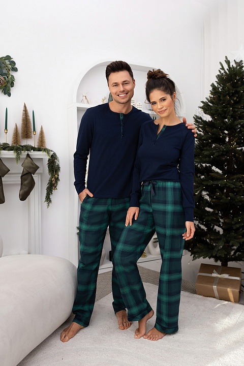 Мужская пижама Luke состоит из лонгслива с длинными рукавами и брюк прямого кроя в крупную клетку. Круглый вырез горловины, воротник на кулиске. Брюки оформлены удобными карманами. Идеальный вариант для домашнего отдыха.
