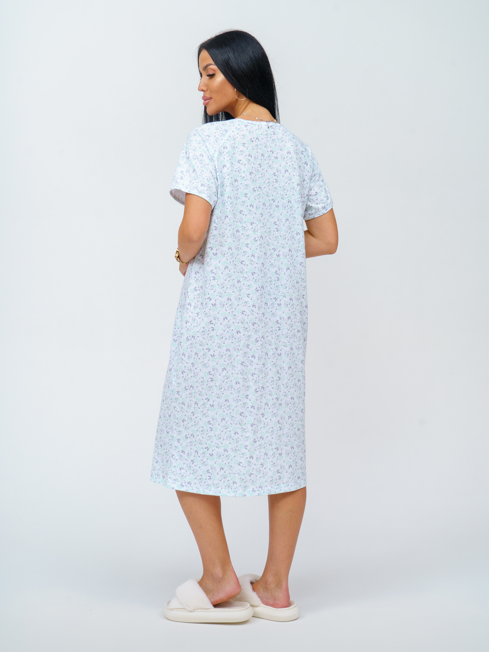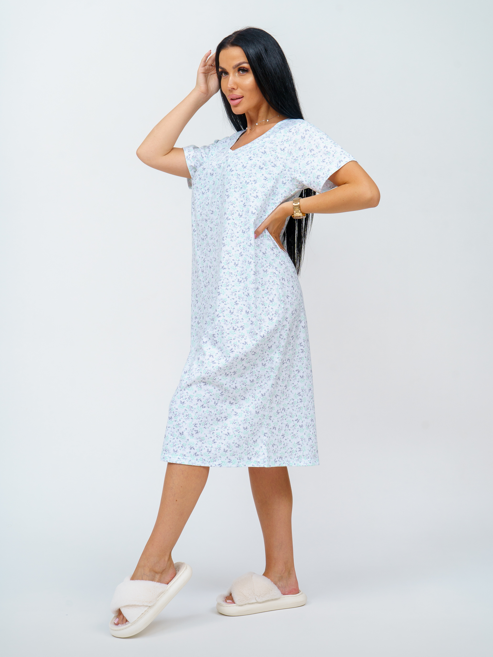 Длина ниже колена: Идеальная длина ниже колена делает сорочку подходящей как для домашнего ношения, так и для сна.