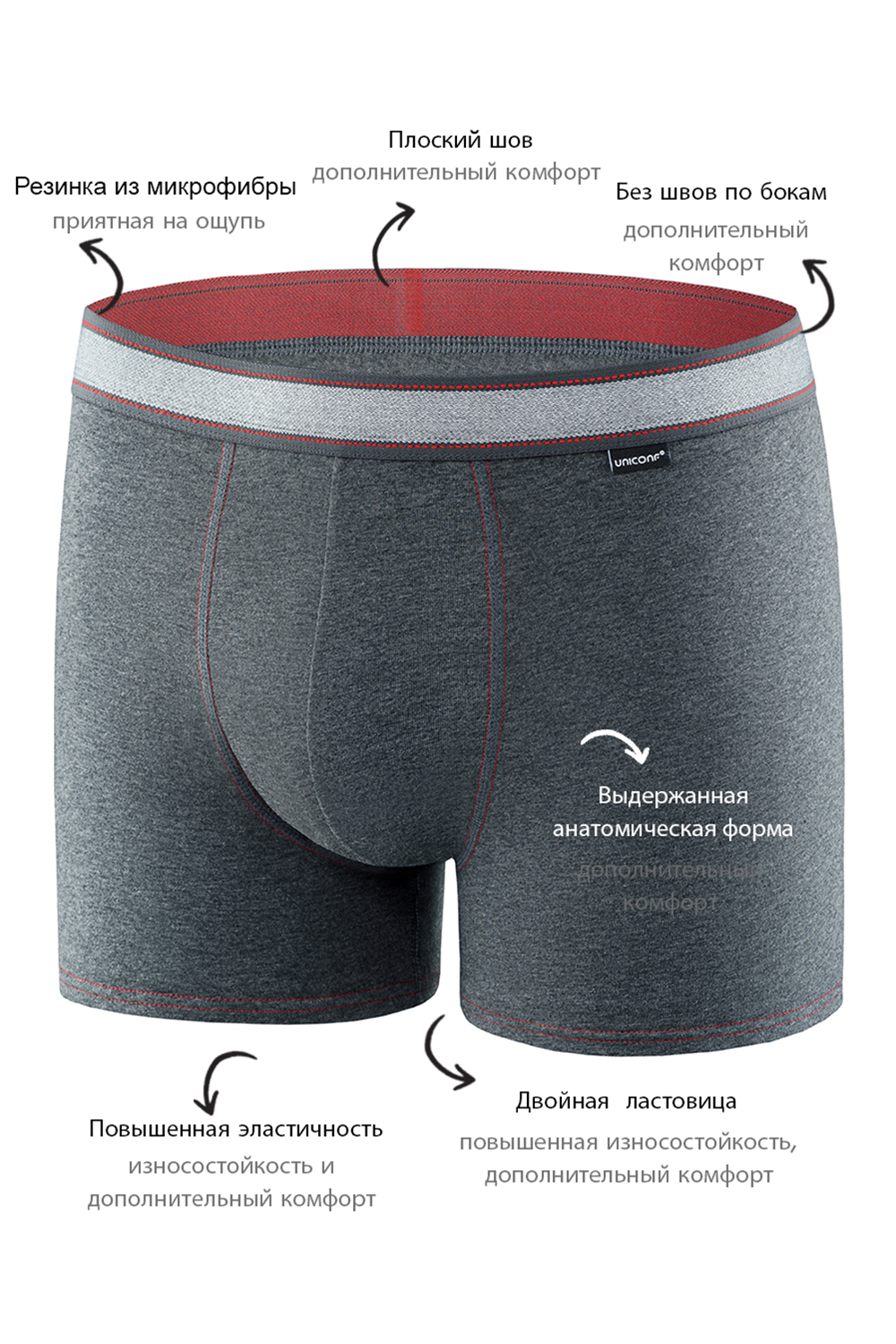 Классические боксеры UNICONF из премиального гипоаллергенного хлопка меланж с добавлением эластана. Пришивная резинка обеспечивает терморегуляцию и комфортное прилегание к телу. Усиленная передняя панель, вшитая ластовица и отсутствие боковых швов делают изделие устойчивым к стиркам и продлевают срок использования. Модель не заметна под одеждой, имеет анатомически правильный крой, что в сочетании с инновационными технологиями обработки швов позволяет сделать фигуру визуально более подтянутой и спортивной.