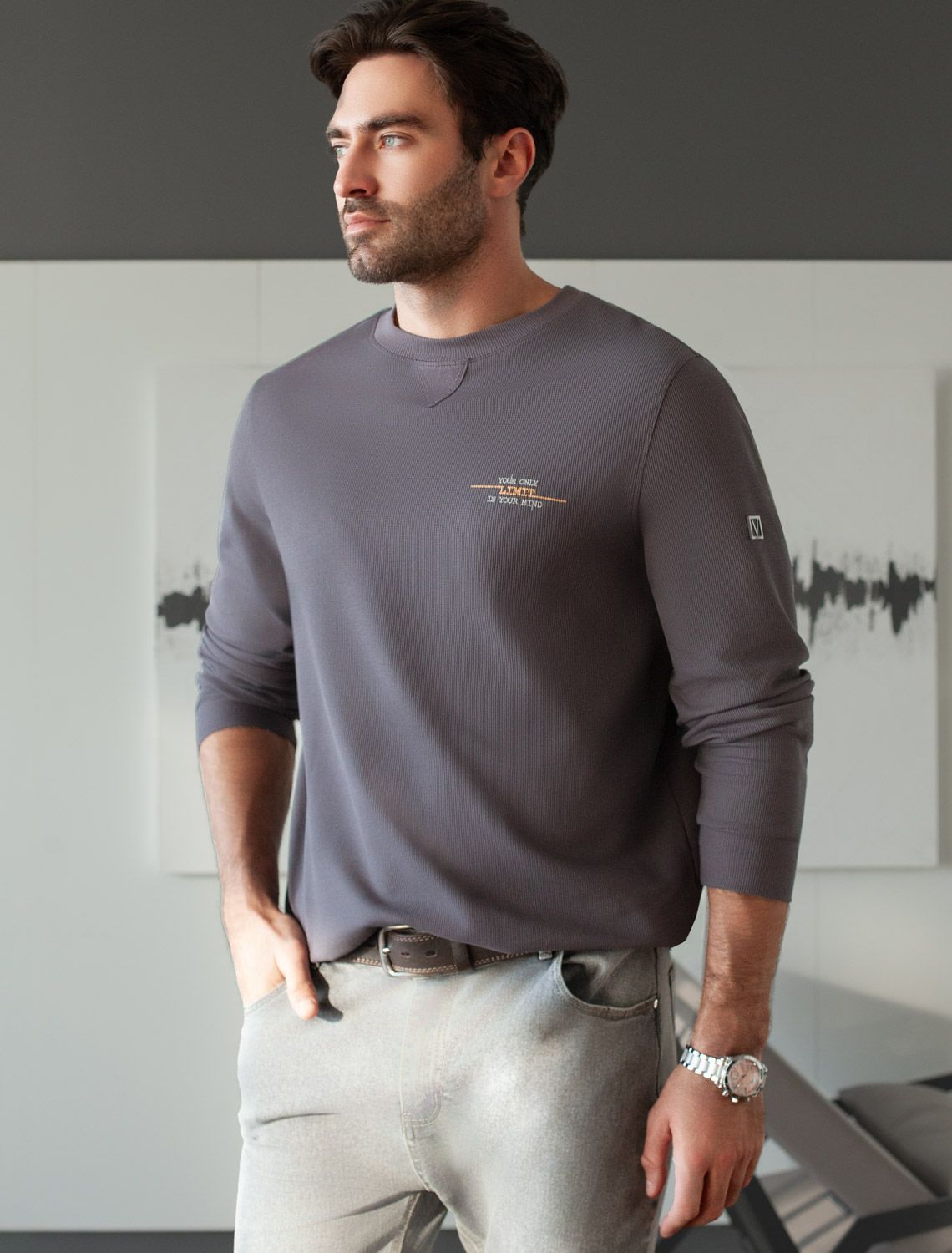 Легкий и невероятно комфортный джемпер серого цвета создан для повседневного образа. Мягкий фактурный эластичный трикотаж приятно ощущается на теле, не сковывает движения и отлично подходит для носки в любое время года. Полуприлегающий крой обеспечивает свободу и удобство, позволяя выглядеть стильно и чувствовать себя уверенно каждый день. Круглый ворот украшен декоративной нашивкой в виде перевернутого треугольника, добавляющей оригинальности.. Манжеты на рукавах и по низу аккуратно оформлены, что придает завершенность внешнему виду и способствует сохранению формы джемпера после длительной носки и многочисленных стирок. Принт в виде небольшой надписи добавляет яркости, подчеркивая индивидуальность каждого мужчины. Перевод надписи: Уour only limit is your mind - Твой единственный предел — твой разум.