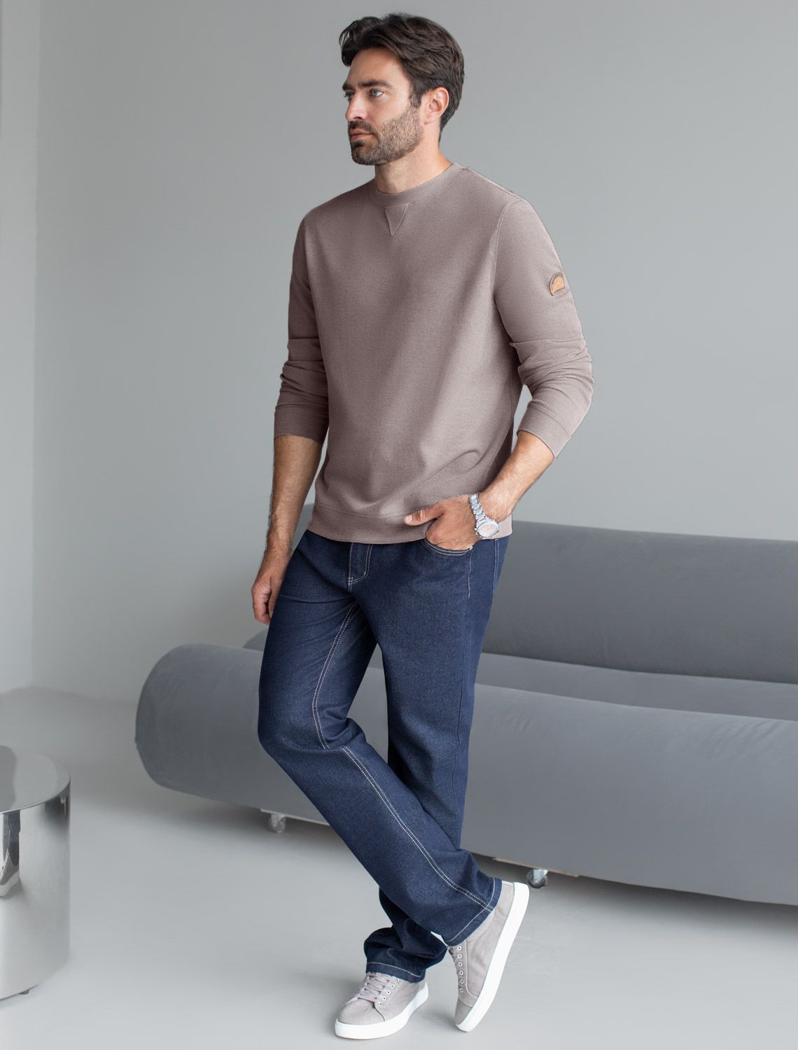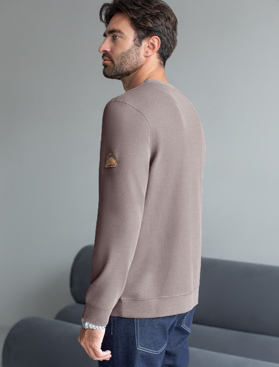 Легкий и невероятно комфортный джемпер коричневого цвета создан для повседневного образа. Мягкий фактурный эластичный трикотаж приятно ощущается на теле, не сковывает движения и отлично подходит для носки в любое время года. Полуприлегающий крой обеспечивает свободу и удобство, позволяя выглядеть стильно и чувствовать себя уверенно каждый день. Круглый ворот украшен декоративной нашивкой в виде перевернутого треугольника, добавляющей оригинальности.. Манжеты на рукавах и по низу аккуратно оформлены, что придает завершенность внешнему виду и способствует сохранению формы джемпера после длительной носки и многочисленных стирок. На груди нашивка из экокожи в виде логотипа бренда, подчеркивающая индивидуальность каждого мужчины.