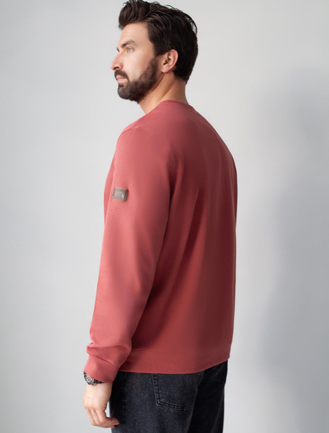Легкий и невероятно комфортный джемпер кирпичного цвета создан для повседневного образа. Мягкий фактурный эластичный трикотаж приятно ощущается на теле, не сковывает движения и отлично подходит для носки в любое время года. Полуприлегающий крой обеспечивает свободу и удобство, позволяя выглядеть стильно и чувствовать себя уверенно каждый день. Круглый ворот украшен декоративной нашивкой в виде перевернутого треугольника, добавляющей оригинальности.. Манжеты на рукавах и по низу аккуратно оформлены, что придает завершенность внешнему виду и способствует сохранению формы джемпера после длительной носки и многочисленных стирок. Принт в виде небольшой надписи добавляет яркости, подчеркивая индивидуальность каждого мужчины. Перевод надписи: Live by а compass not by clock - Жить по компасу, а не по часам.