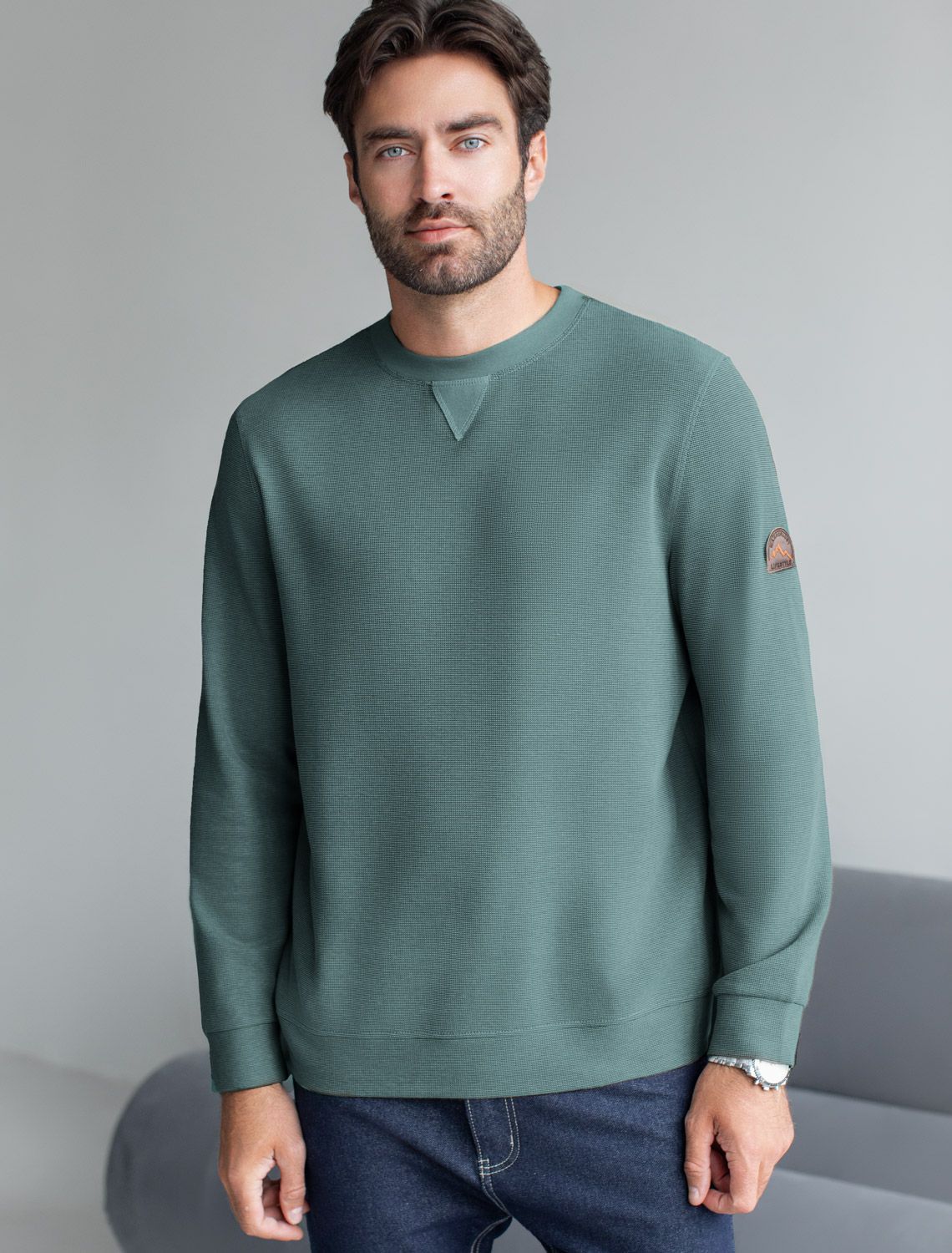 Легкий и невероятно комфортный джемпер изумрудного цвета создан для повседневного образа. Мягкий фактурный эластичный трикотаж приятно ощущается на теле, не сковывает движения и отлично подходит для носки в любое время года. Полуприлегающий крой обеспечивает свободу и удобство, позволяя выглядеть стильно и чувствовать себя уверенно каждый день. Круглый ворот украшен декоративной нашивкой в виде перевернутого треугольника, добавляющей оригинальности.. Манжеты на рукавах и по низу аккуратно оформлены, что придает завершенность внешнему виду и способствует сохранению формы джемпера после длительной носки и многочисленных стирок. На груди нашивка из экокожи в виде логотипа бренда, подчеркивающая индивидуальность каждого мужчины.