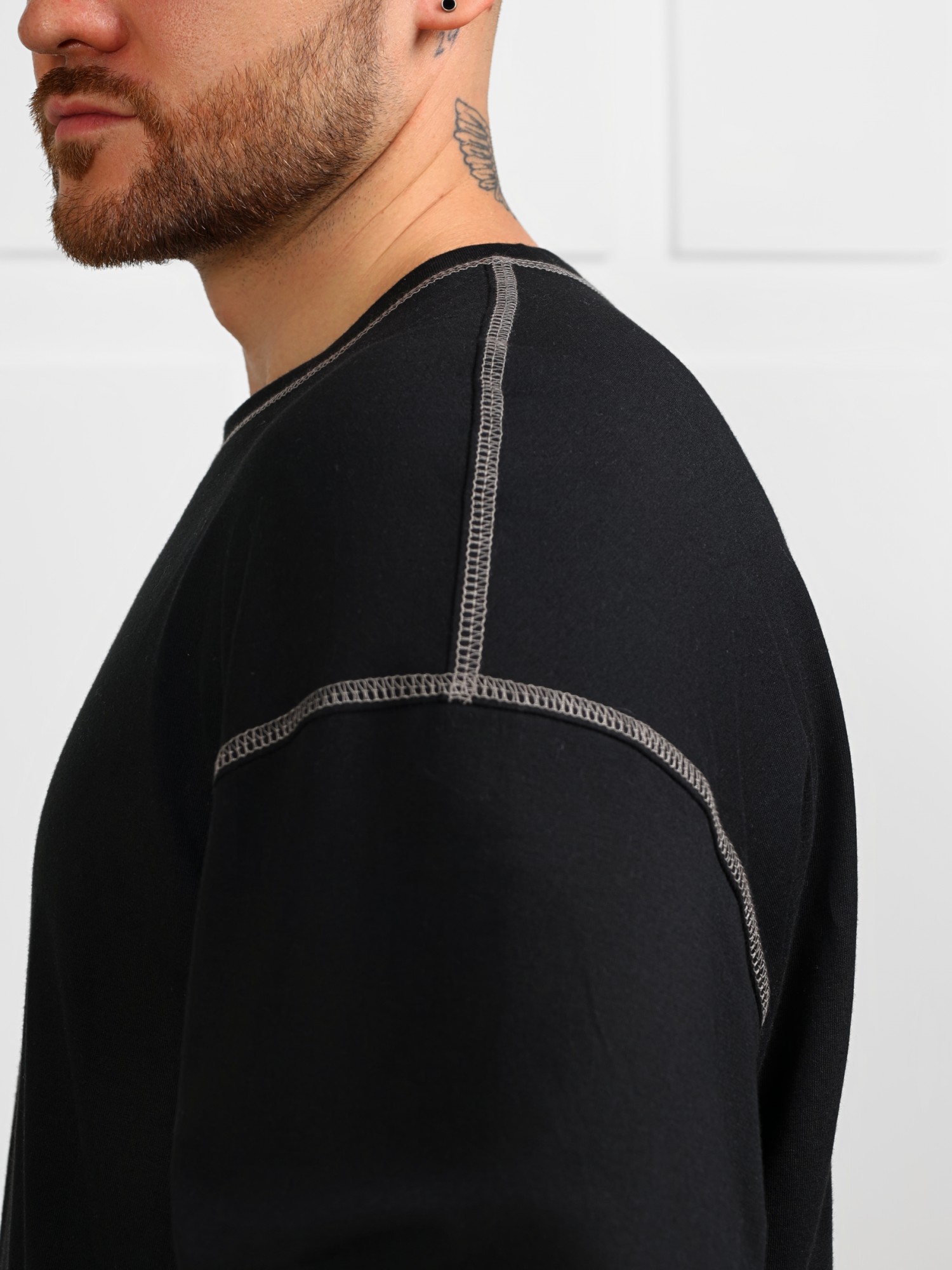 Джемпер мужской черный из трикотажного полотна кулирного переплетения. Модель со спущенной линией плеч, втачными рукавами, горловиной овальной формы, обработанной втачной планкой. В верхней части спинки - декоративная нашивка; по горловине, плечам, проймам, низу рукавов и низу джемпера - декоративные строчки контрастными нитками. Джемпер хорошо сочетается с брюками "Генри-1".