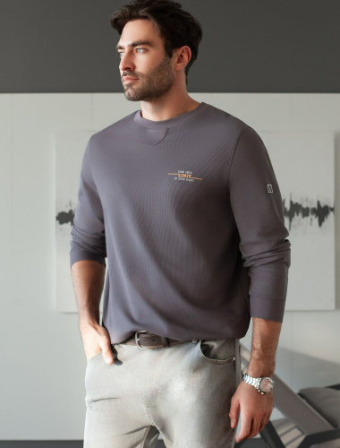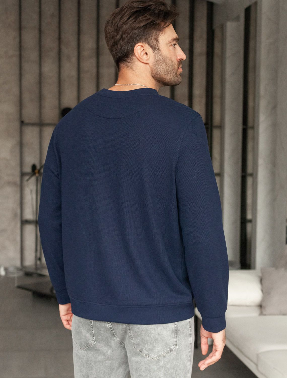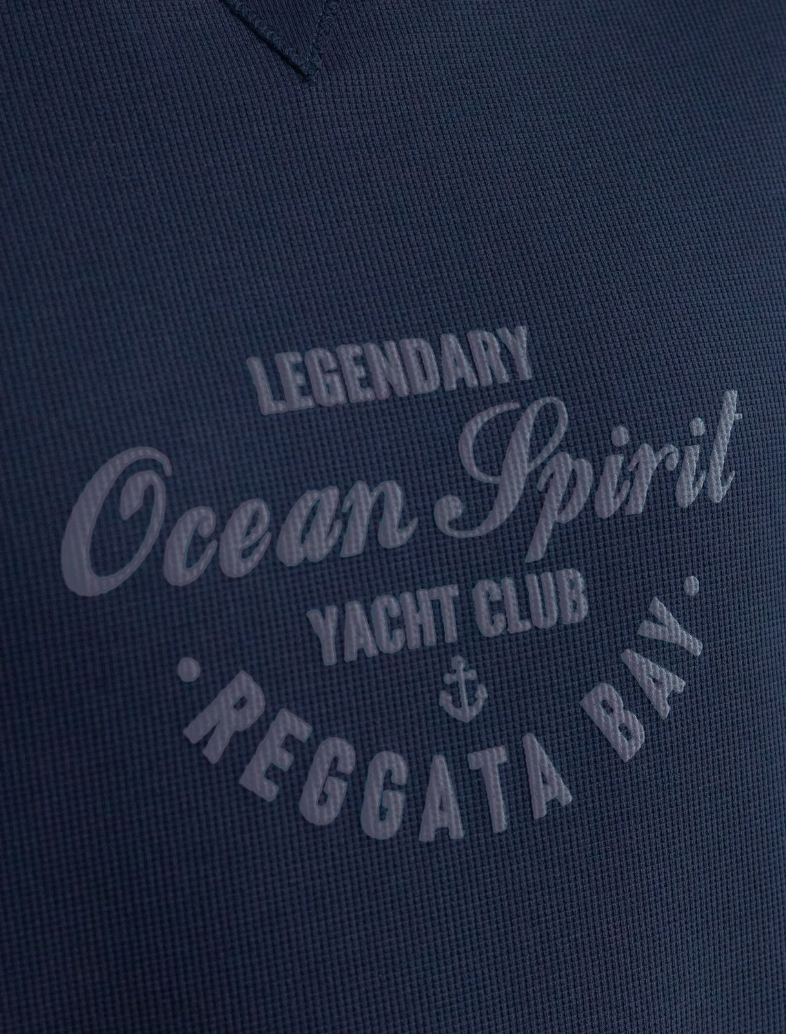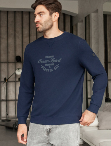 Легкий и невероятно комфортный джемпер светло-синего цвета создан для повседневного образа. Мягкий фактурный эластичный трикотаж приятно ощущается на теле, не сковывает движения и отлично подходит для носки в любое время года. Полуприлегающий крой обеспечивает свободу и удобство, позволяя выглядеть стильно и чувствовать себя уверенно каждый день. Круглый ворот украшен декоративной нашивкой в виде перевернутого треугольника, добавляющей оригинальности.. Манжеты на рукавах и по низу аккуратно оформлены, что придает завершенность внешнему виду и способствует сохранению формы джемпера после длительной носки и многочисленных стирок. Принт в виде небольшой надписи добавляет яркости, подчеркивая индивидуальность каждого мужчины. Перевод надписи: Legendary ocean spirit yacht club regatta bay - Легендарный яхт-клуб Ocean Spirit, регатная бухта.